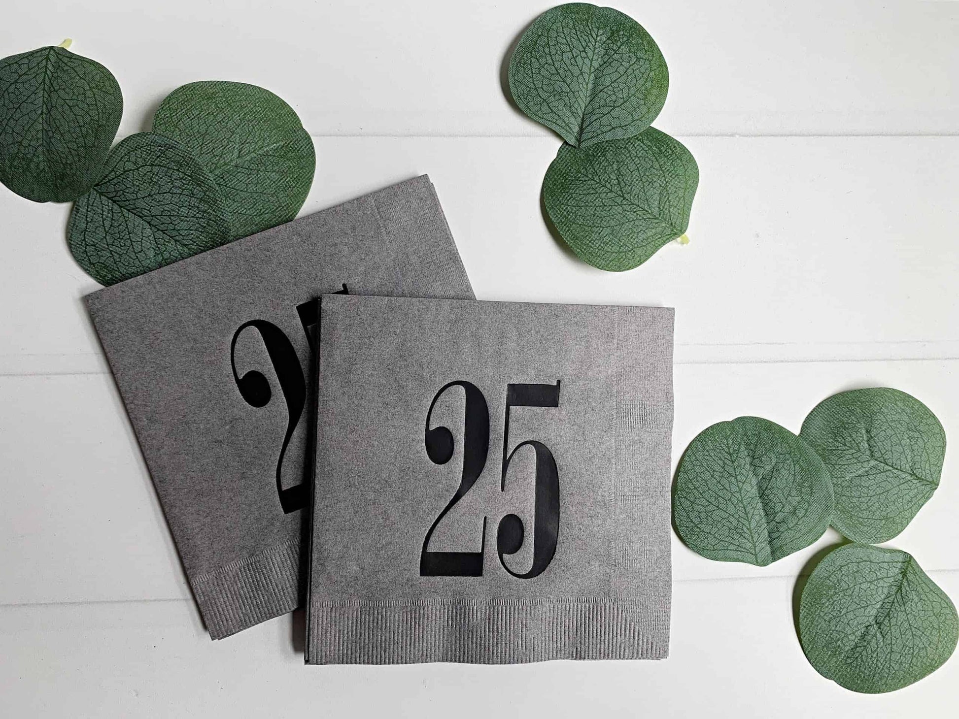Design: Each grey cocktail napkin is thoughtfully stamped with a bold "25" in matte black foil, adding a touch of glamour to your celebration.