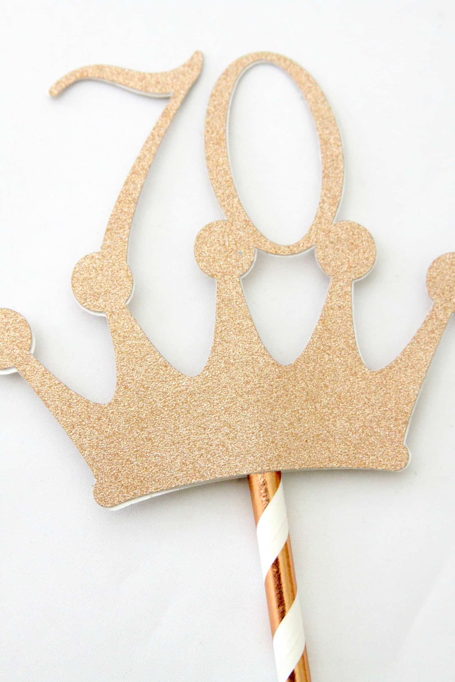 This 70th birthday cake topper is 3.5 inches high and 4 inches wide (not including pick). It is mounted on a 4 inch rose gold striped paper straw.