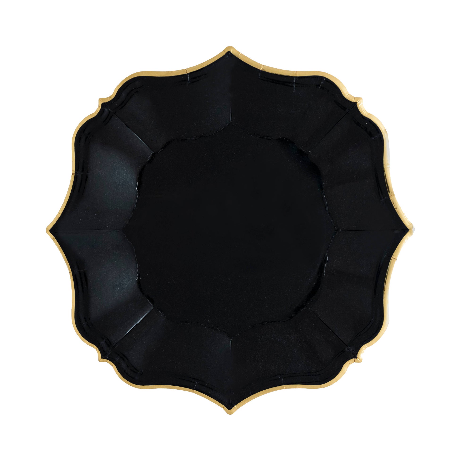 7" black scalloped paper plate with a gold foil edge
