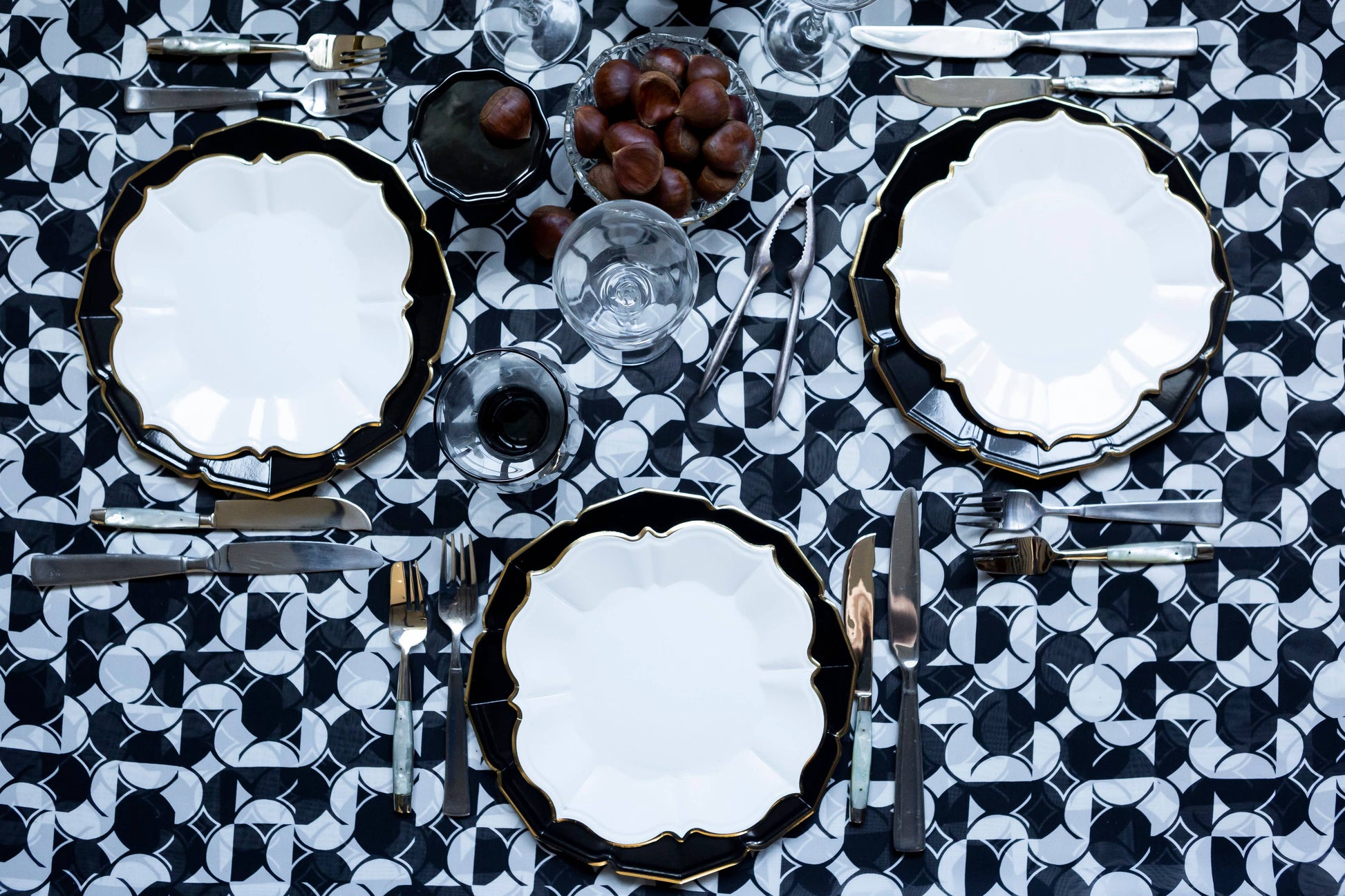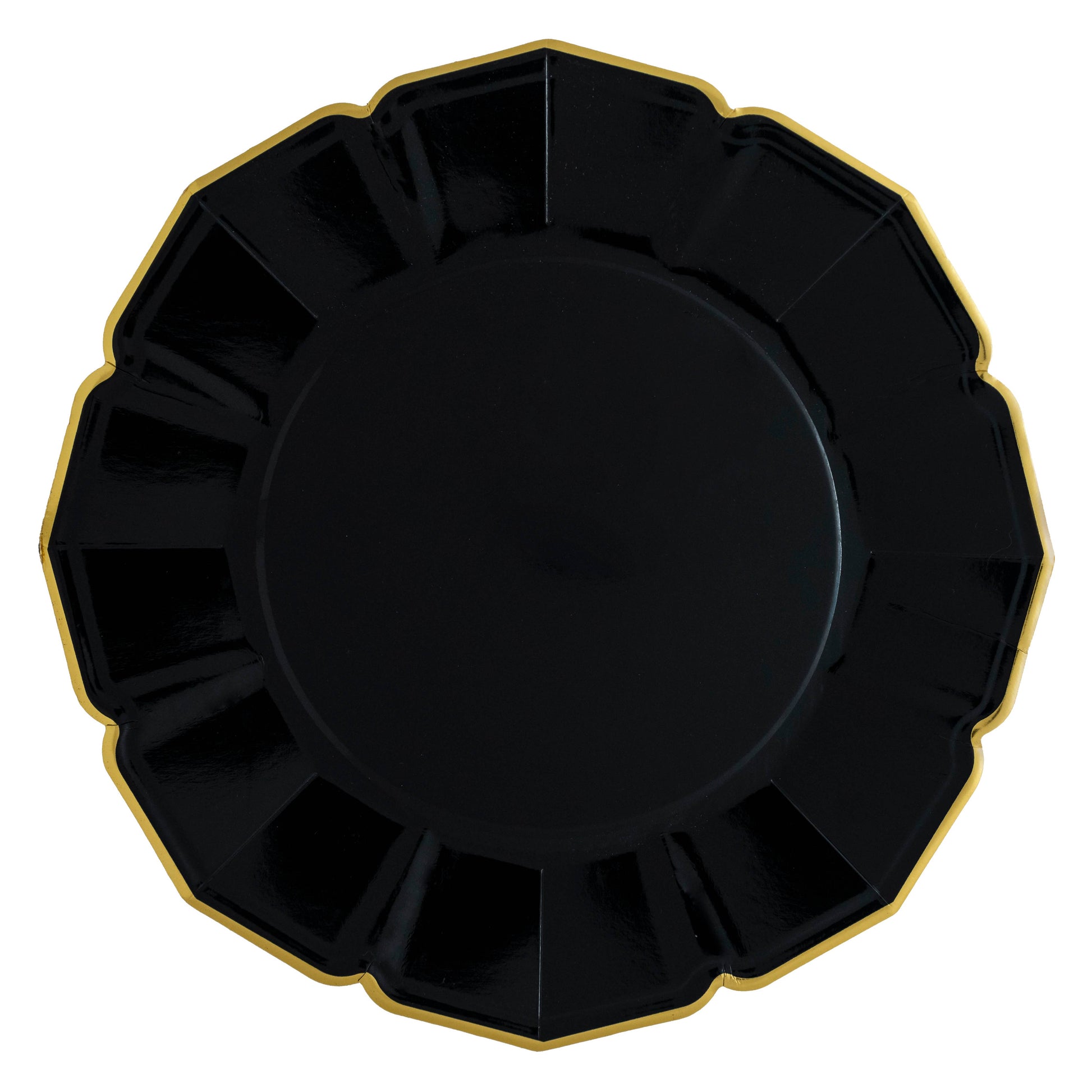 Black scalloped dinner plates with gold foil edge details. Pretty plates for so many occasions - birthdays, New Year's eve, engagement parties, anniversary parties. Layer with our other scalloped plates in lunch and dessert sizes for a truly designer party tablescape.