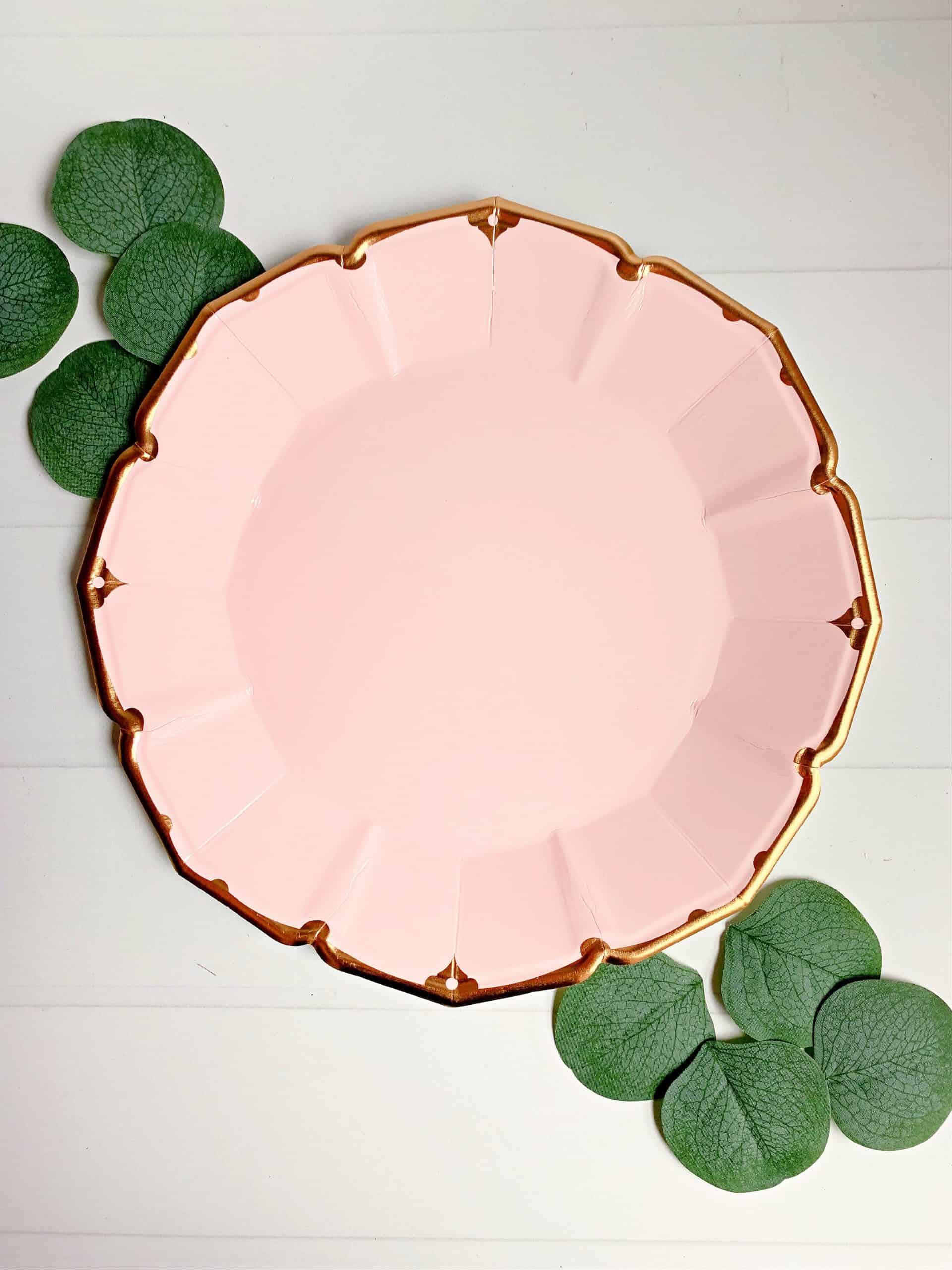 Blush pink scalloped dinner plates with gold foil edge details. Pretty plates for so many occasions - birthdays, New Year's eve, engagement parties, anniversary parties. Layer with our other scalloped plates in lunch and dessert sizes for a truly designer party tablescape.