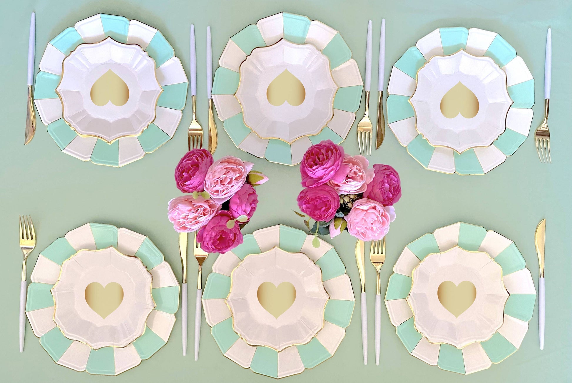Celebrate dessert in style with our white and gold-edged dessert plates with a sweet gold foil heart in the middle of each. They are the perfect size for cake or dessert. Perfect for a baby shower, bridal shower, or wedding.