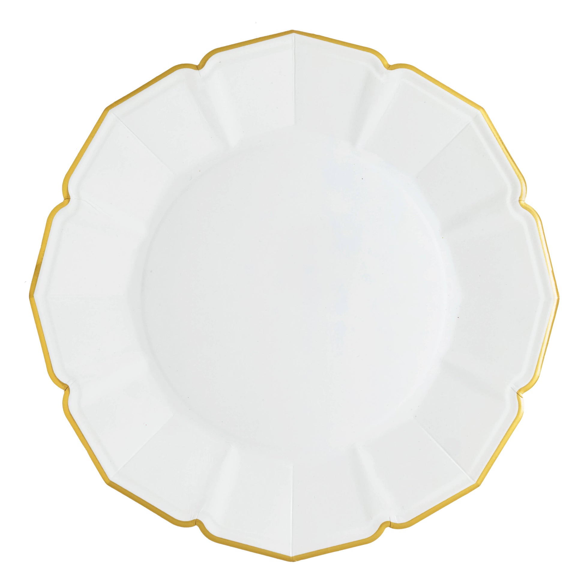 White scalloped dinner plates with gold foil edge details. Pretty plates for so many occasions - birthdays, New Year's eve, engagement parties, anniversary parties. Layer with our other scalloped plates in lunch and dessert sizes for a truly designer party tablescape.