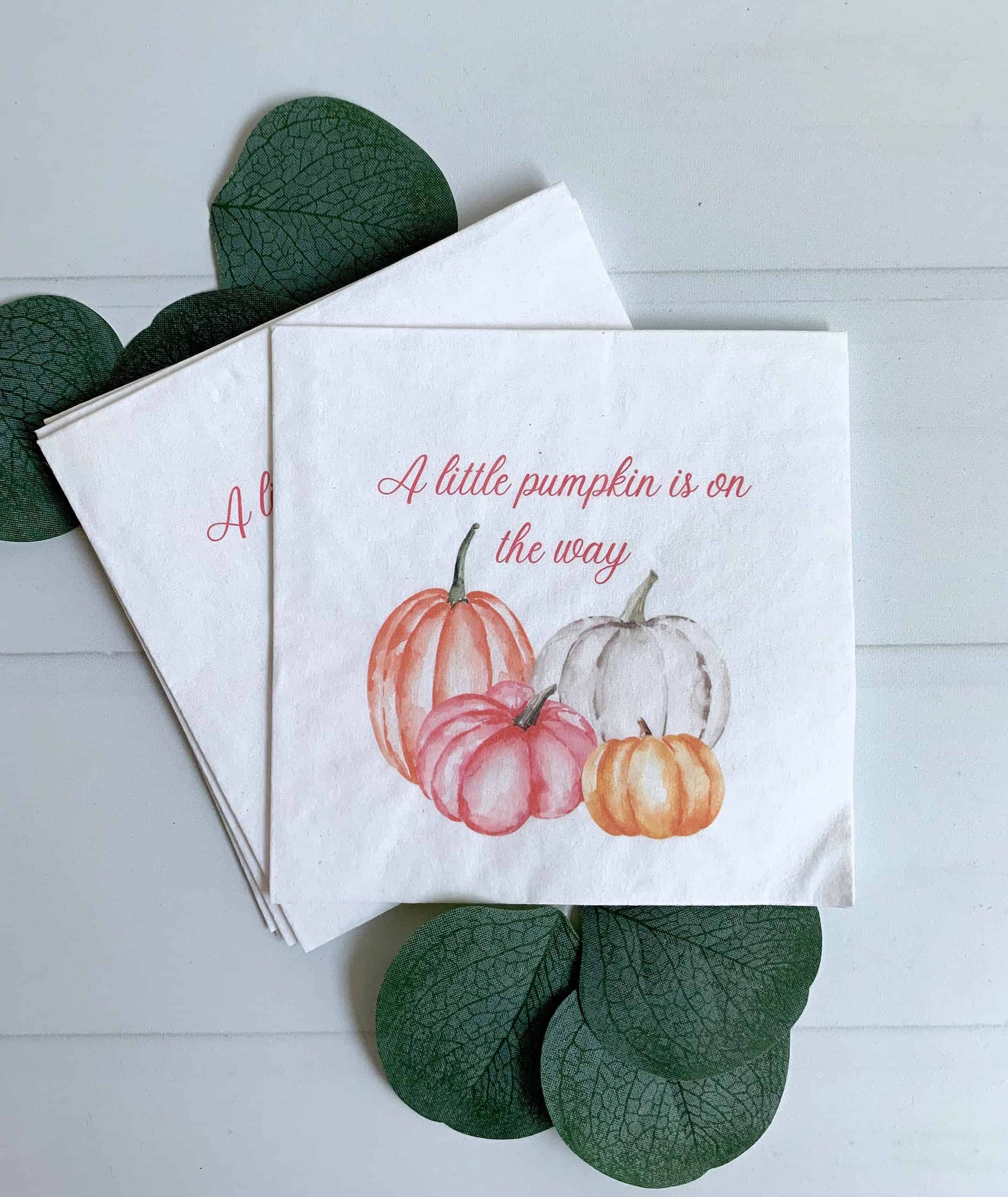 * Color: White background with pink and orange pumpkin design - with "a little pumpkin is on the way.." printed on each.