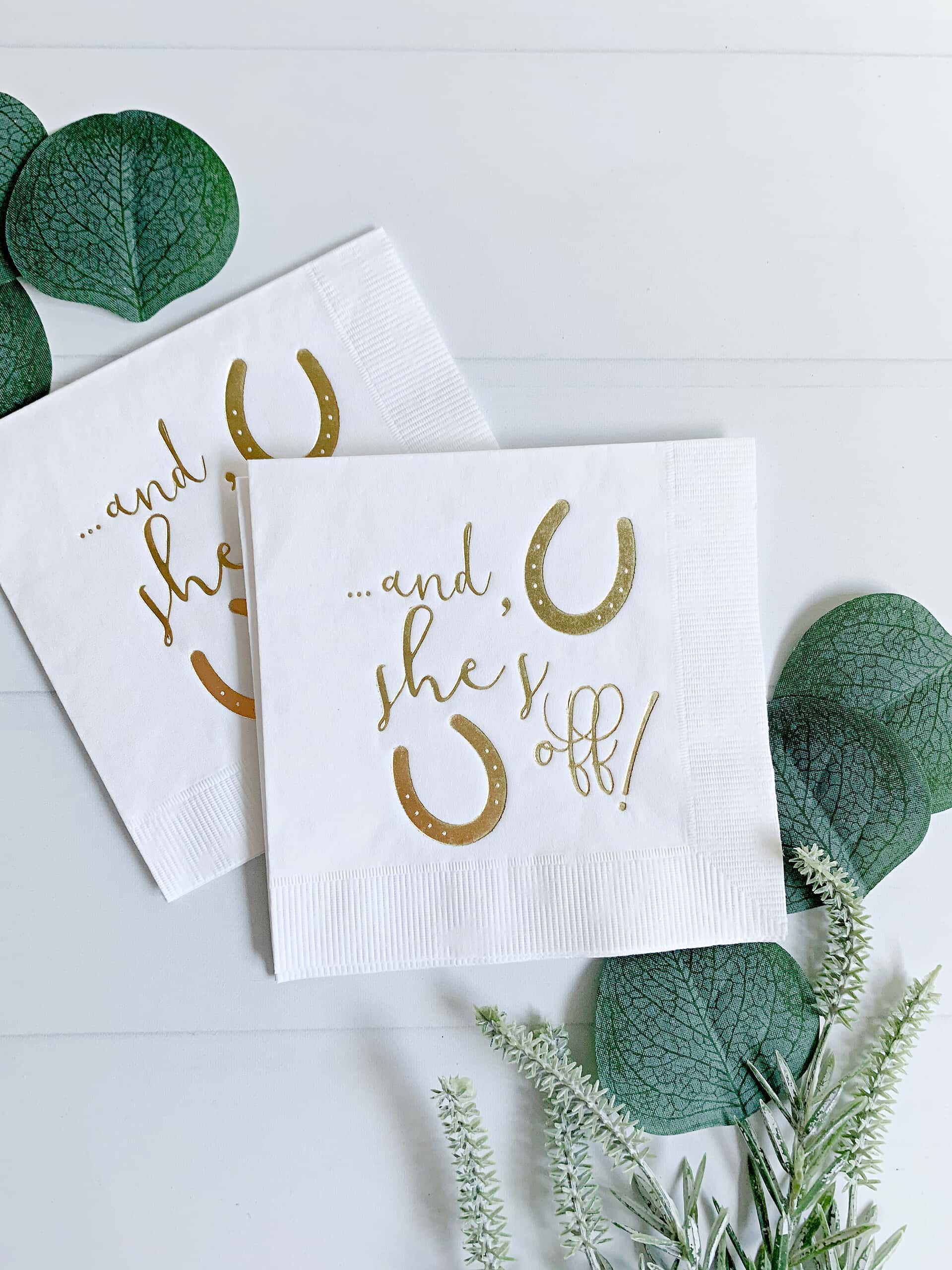If you're throwing a Kentucky Derby party, graduation party, tea party, or bridal shower, EnFete's "And She's Off" gold foil on white cocktail napkins will add a touch of charm to your event. Measuring 4.75 x 4.75 inches when folded, these three-ply tissue napkins are perfect for serving drinks and snacks in style. Our original design features a stunning gold foil stamped "And She's Off!" message on white cocktail-sized napkins, giving your party the perfect finishing touch. Whether it's a birthday celebration, baby shower, engagement party, or wedding shower, these adorable napkins will be the highlight of your event.