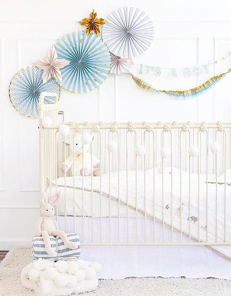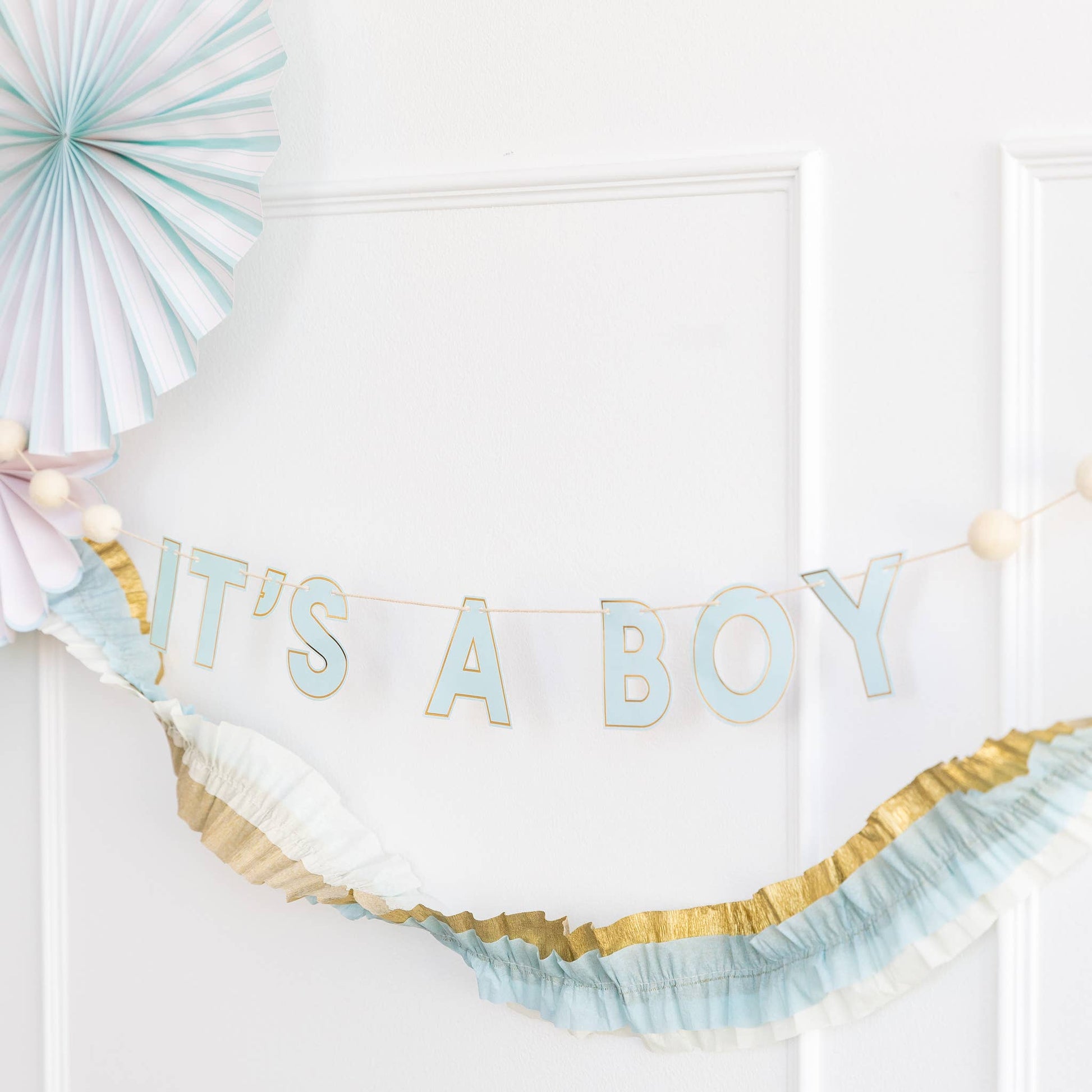 This set of one It's a Boy - blue and gold banner with pom poms is the perfect backdrop to a Baby Boy shower or a fun backdrop for the baby's nursery.