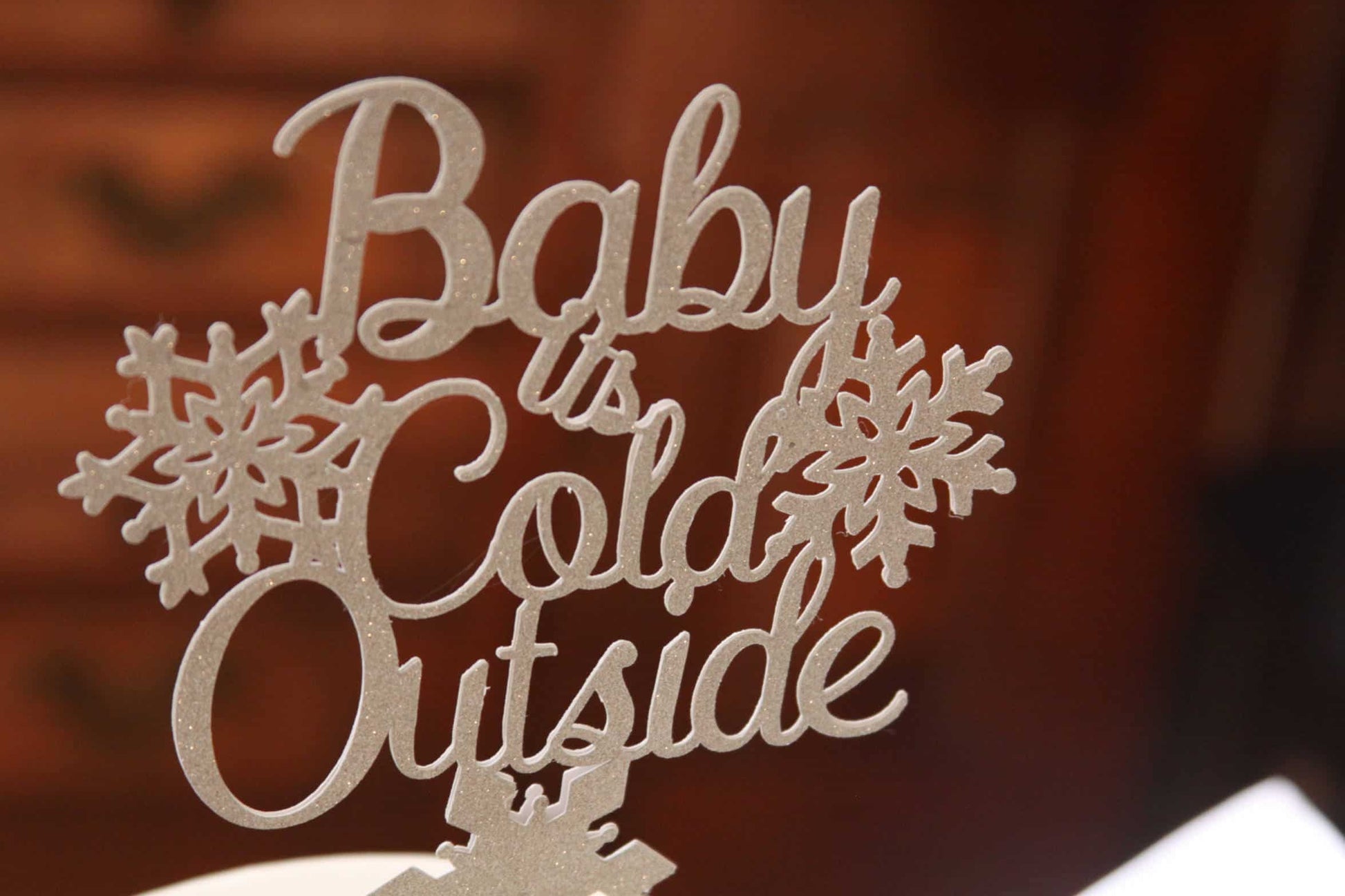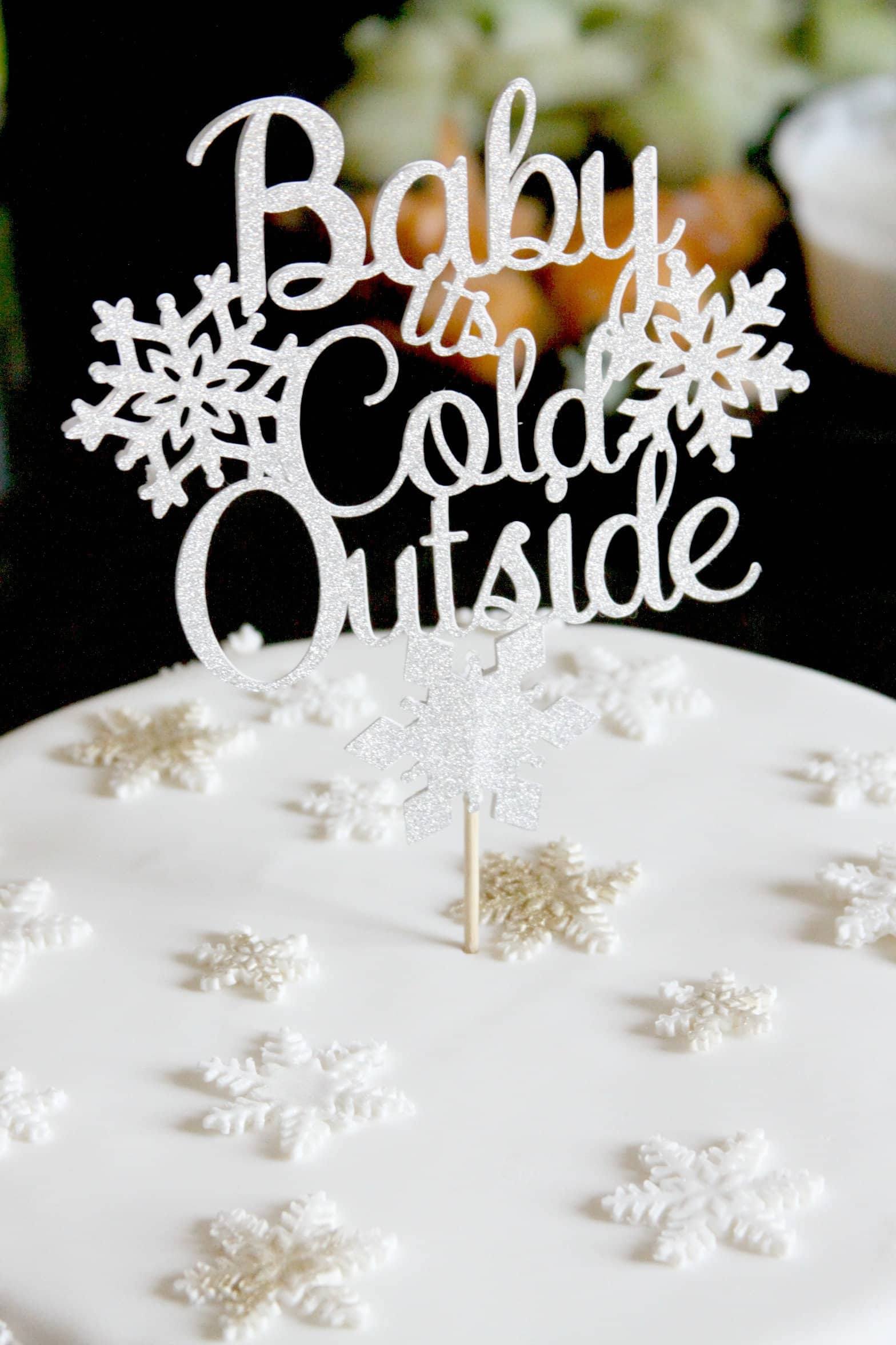 An adorable Baby It's Cold Outside cake topper, perfect for a winter baby shower, wedding, bridal shower or to top a Christmas cake. Use for pies, cakes or a yule log. Perfect for anything with a snowflake theme, or just fun for a holiday cocktail party. Sparkling silver glitter cardstock, finished on both sides. It's the perfect topper for a Winter Wonderland themed party!