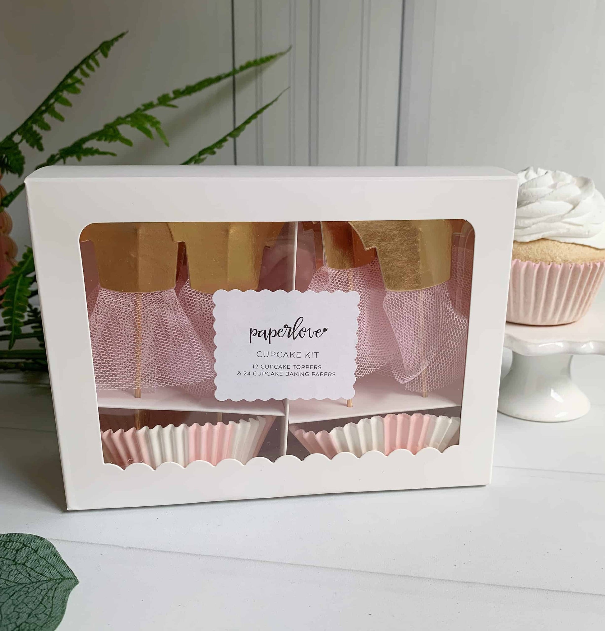 This cupcake kit includes 12 ballerina princess (with real tulle skirts!) cupcake toppers and 24 pink and white striped baking cupcake papers.
