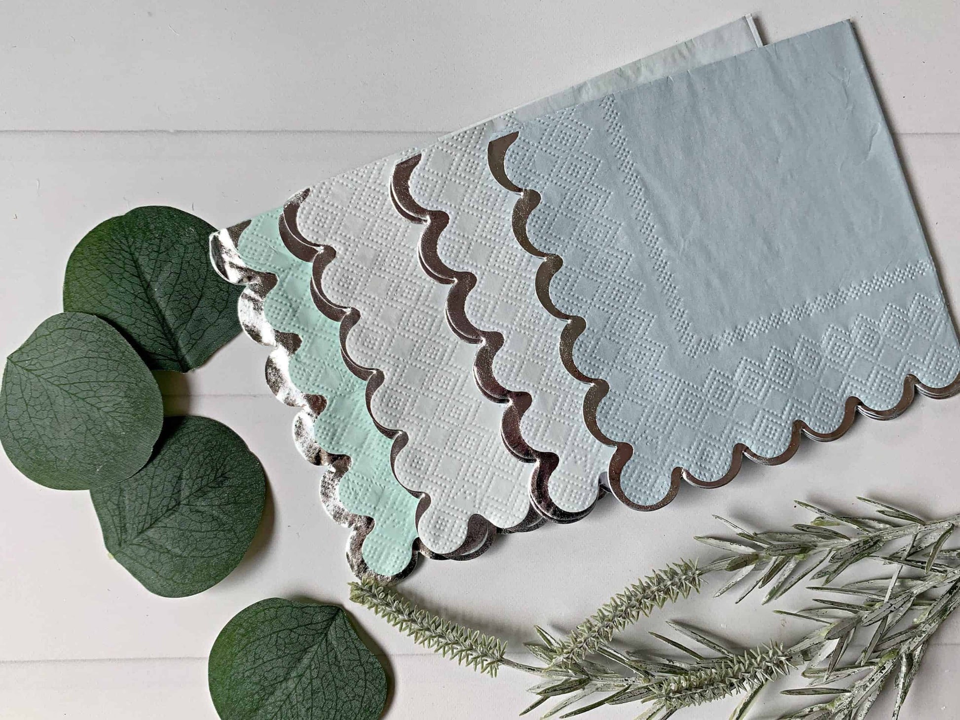 These are sweet and sophisticated smoke blue to pale aqua ombre cocktail napkins. These napkins are perfect for a birhtday, baby shower, wedding shower or bachelorette with their sweet metallic scalloped silver foil edge. The details on these napkins are amazing!