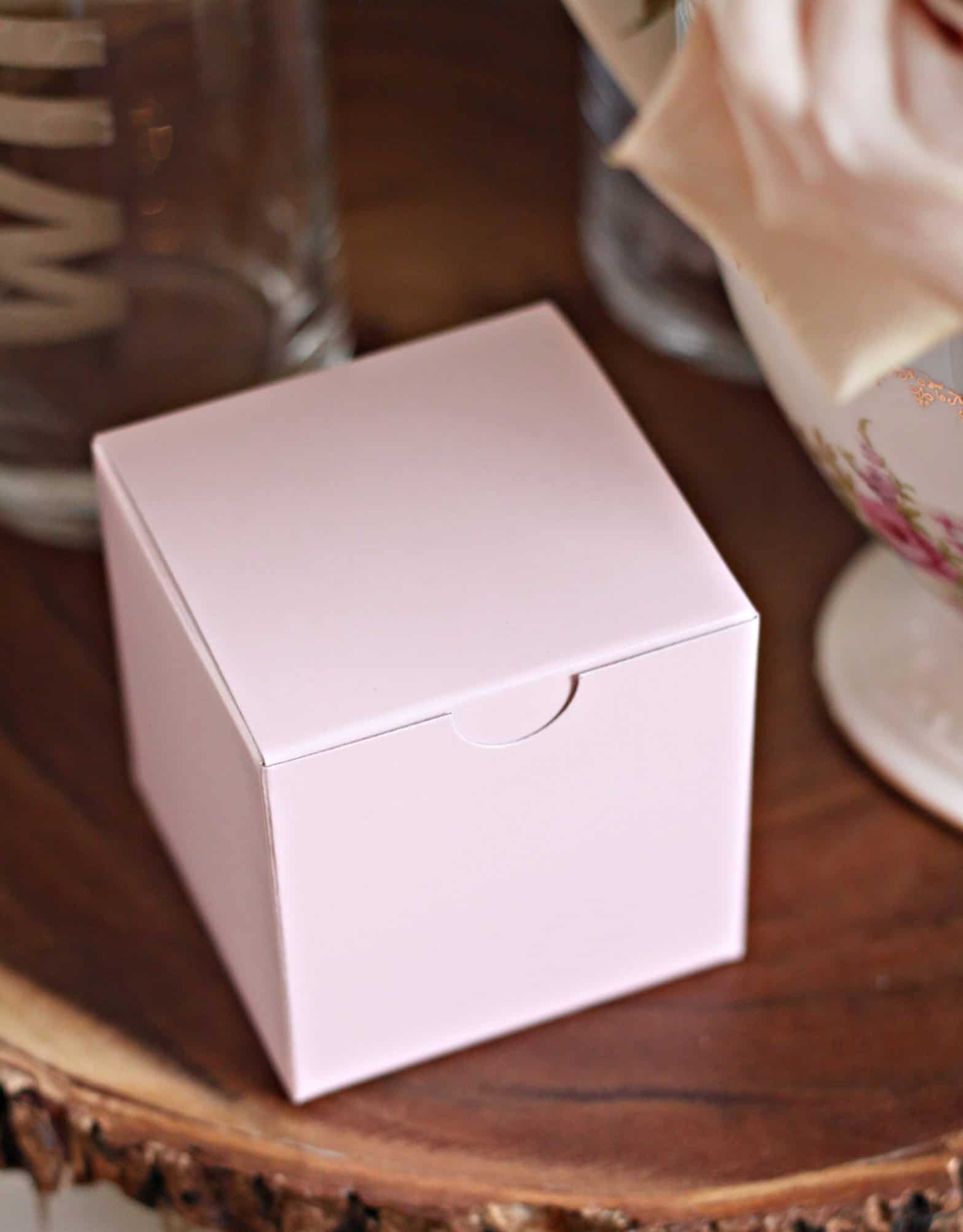 Blush pink gift boxes perfect for wedding favor boxes, bridesmaid gifts, baby shower favors or birthday party favors. They are the perfect size to package lip balms, bath bombs, nail polish, or candle favors.
