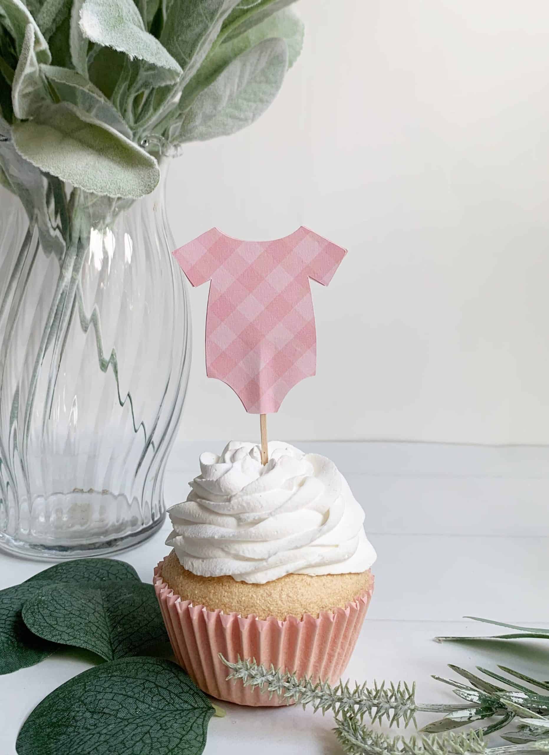 Set of 12 pink gingham onesie cupcake toppers - each onesie measures approximately 2 inches wide. (Small leaf on the cupcake is NOT included, decoration only.)