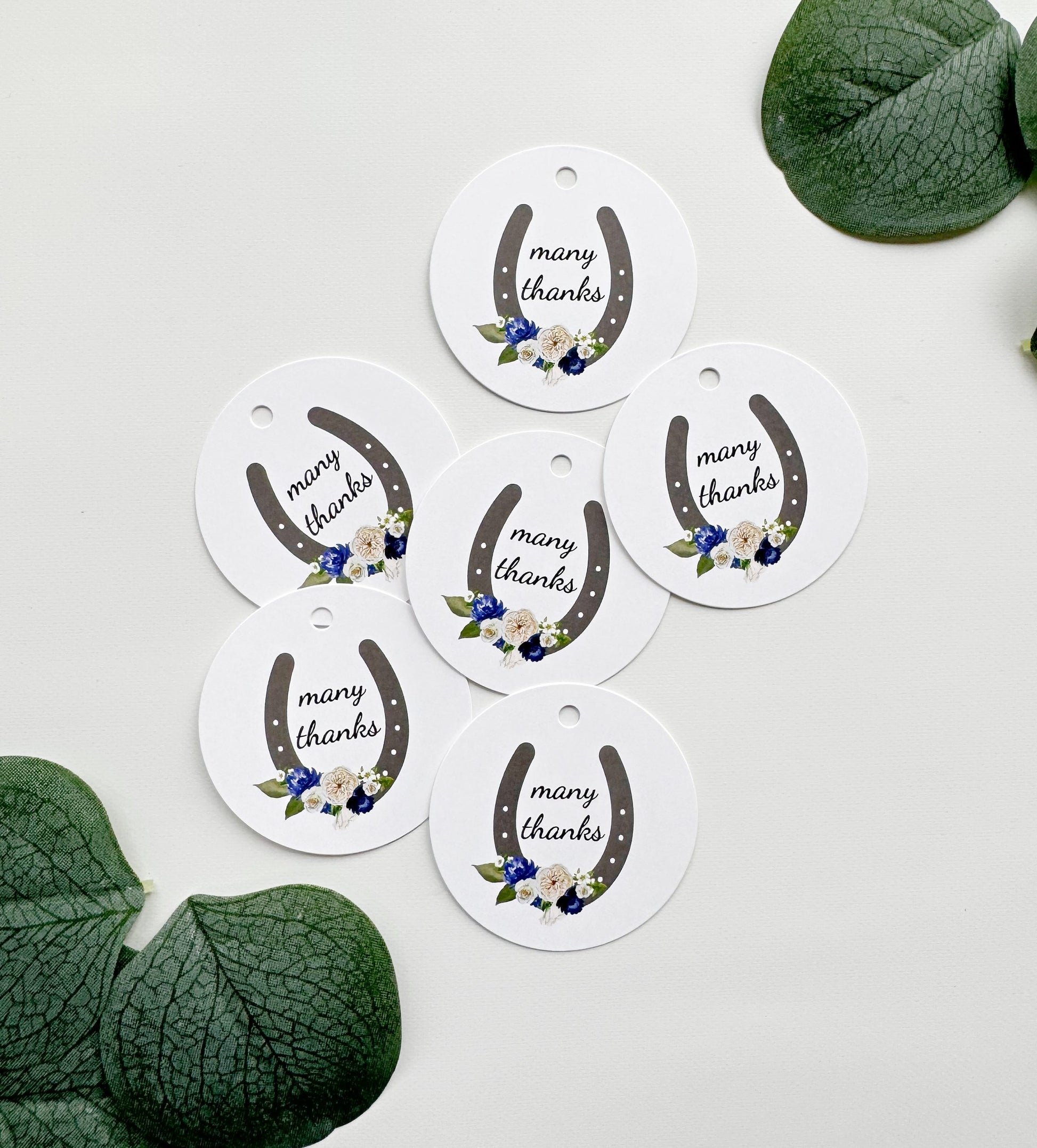Derby party "Many Thanks" tags - perfect for a Kentucky Derby themed bridal shower or baby shower. Perfect for a pony or horse party. Add these tags with a horseshoe adored with navy and cream florals to your nail polish favors for a fun party favor! Hang on wedding welcome bags or wrap bridal party gifts.