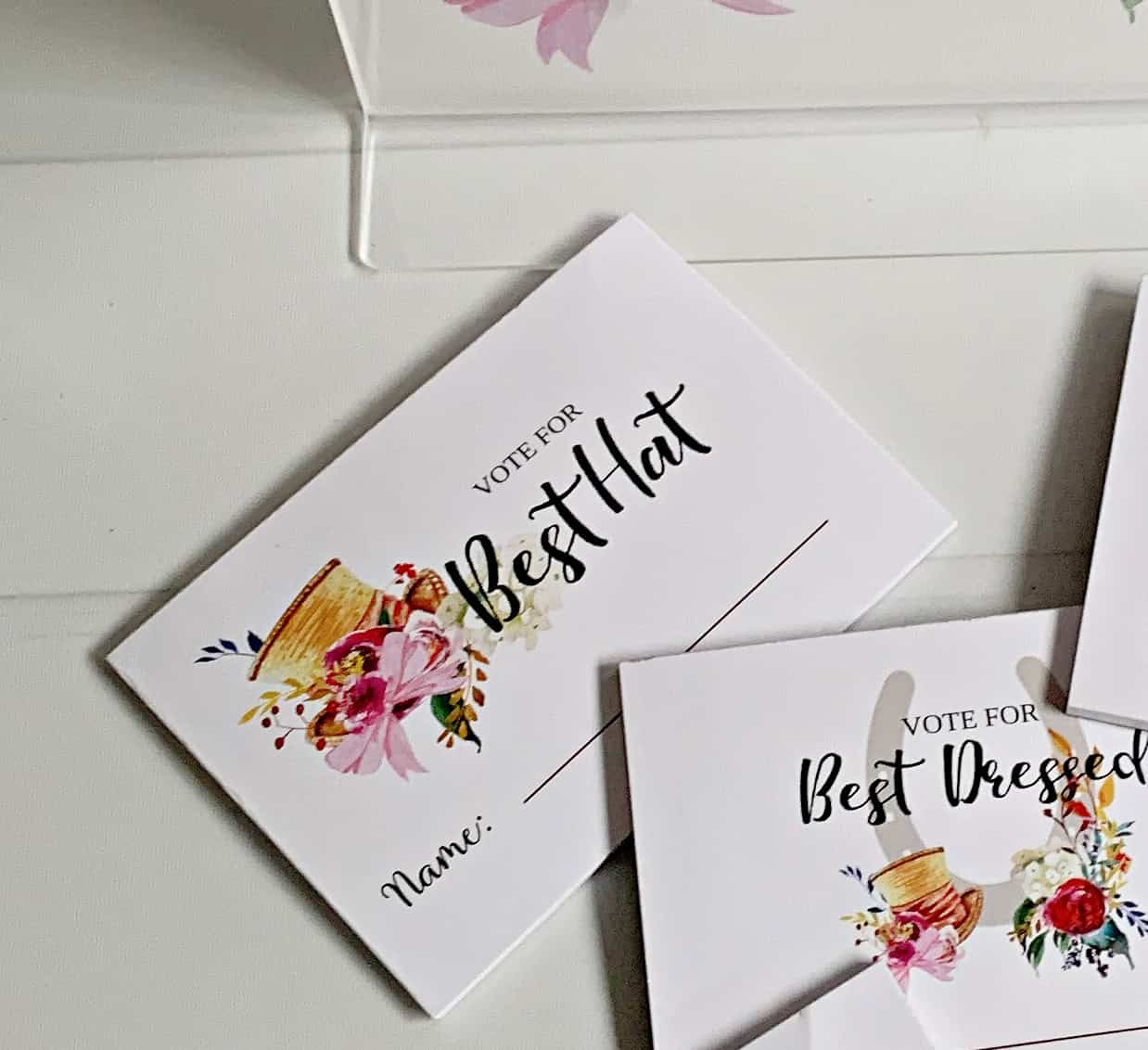 Create a fun and interactive experience at your Kentucky Derby party with EnFete's Derby "Vote for Best Hat" Printed Voting card pad (each voting pad is a separate item; select the ones you want at your party!) The Voting Pad adds fun to your Kentucky Derby Party or Bridal Shower.