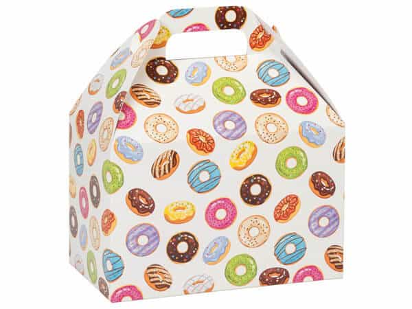 A set of 6 donuts gable boxes have multi-colored frosted donuts on a white background. Perfect for a donut grow up, Donut Kill My Vibe, Baking & Cooking party, or a donut first birthday.