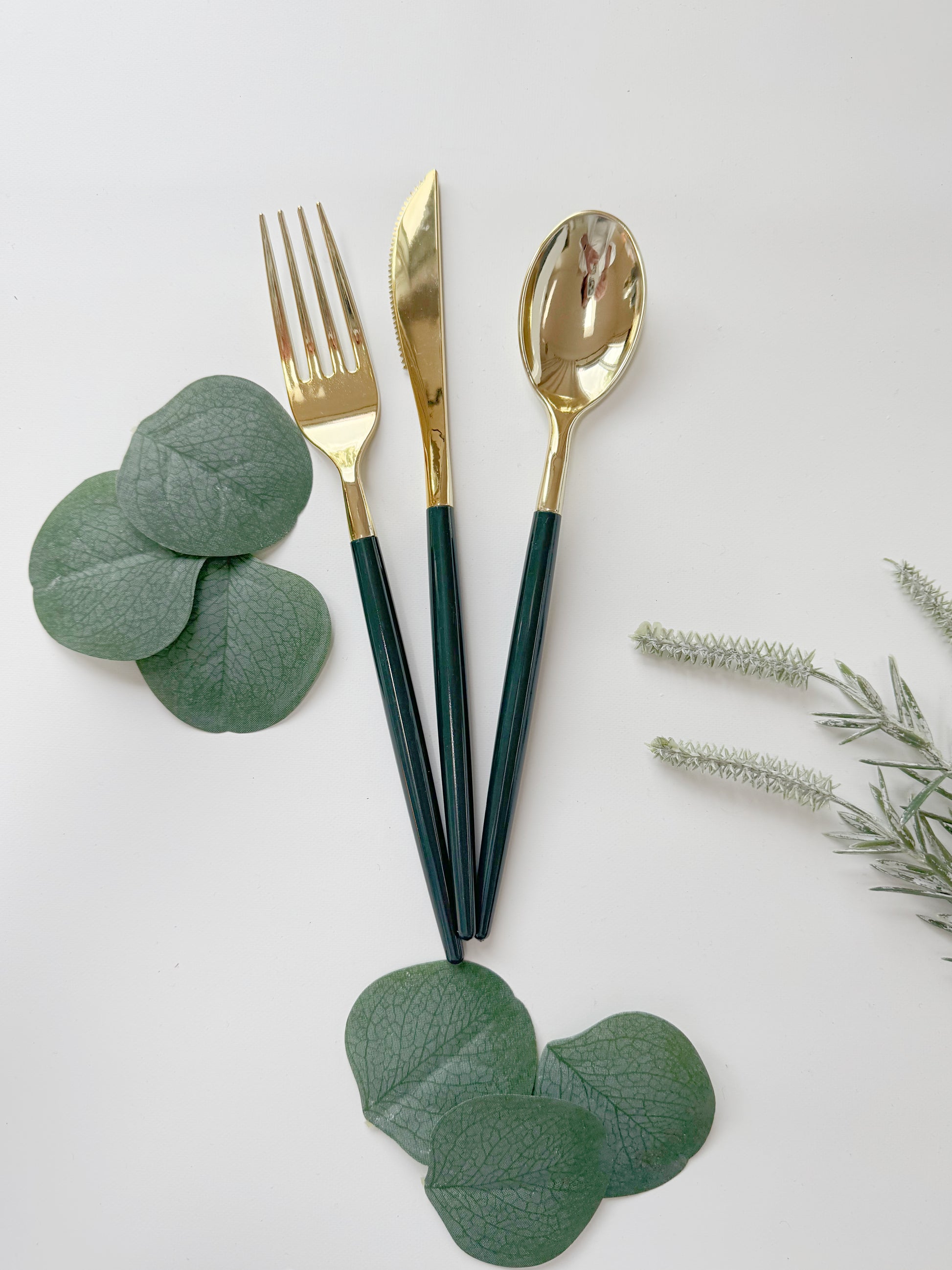Transform your table into a showstopper with this timeless emerald and gold silverware set that does the styling work for you.