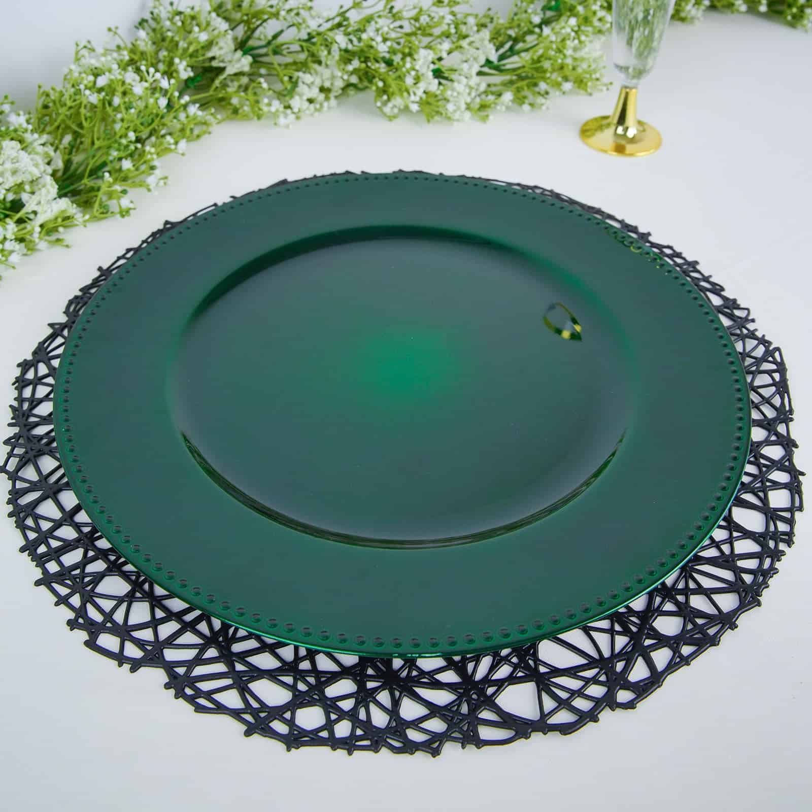 Introducing our exquisite Beaded Edge Emerald Green Charger, a captivating addition to your event decor. Each charger is meticulously crafted to elevate your special moments with an enchanting touch. Whether you're planning a grand wedding reception, setting up a lavish Christmas buffet, or hosting a lush greenery-themed baby shower, these chargers are the epitome of elegance. Their rich Hunter Emerald Green hue resonates perfectly with the holiday spirit and adds a touch of sophistication to any occasion. Bring a sense of opulence to your table settings with these stunning chargers that effortlessly combine style and functionality.
