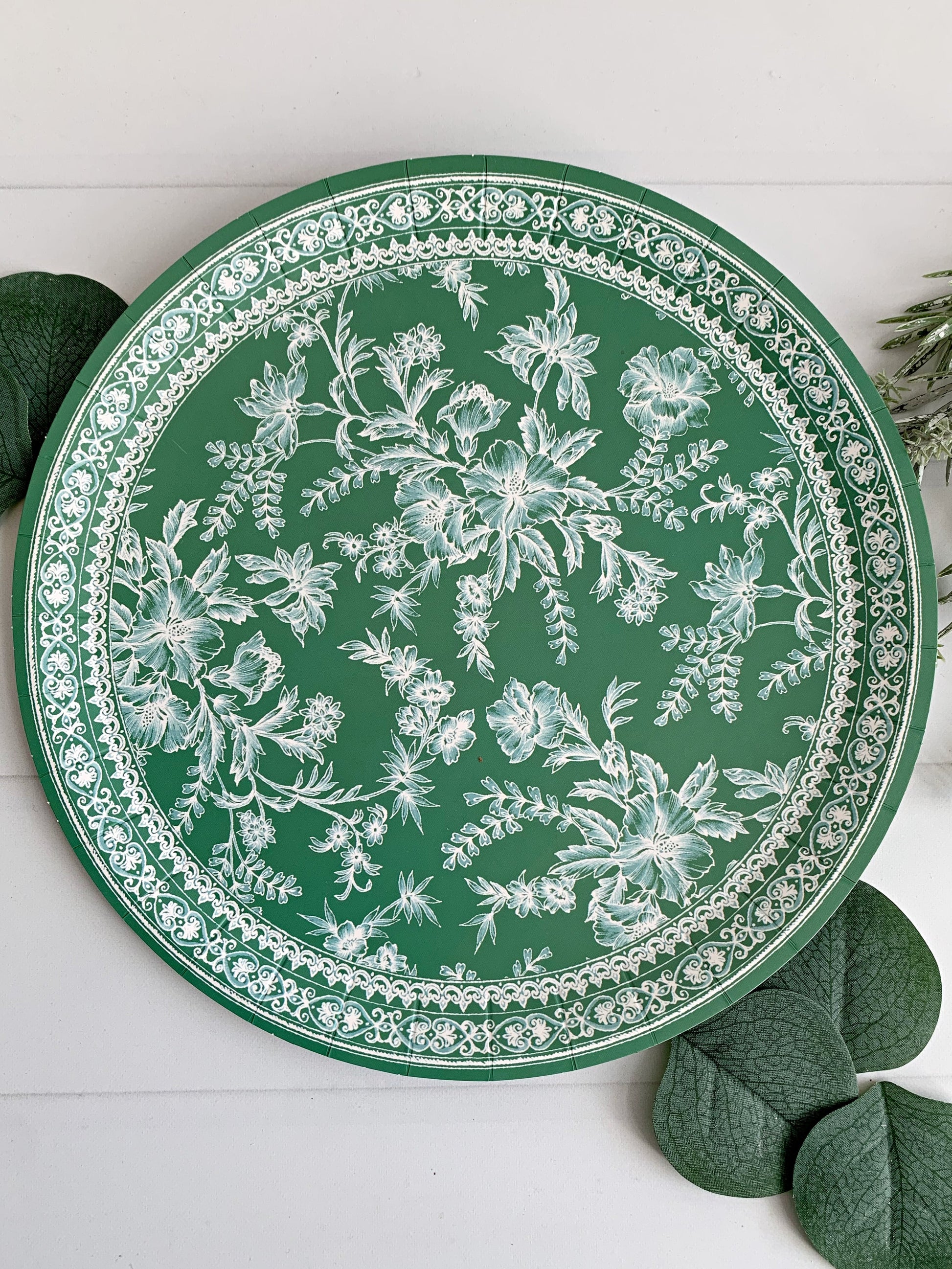 Bring the spirit of the French countryside to your next garden tea party with our emerald green floral toile dinner-sized plates. Includes 10 plates. Perfect for baby showers, bridal showers, birthdays and outdoor picnics.