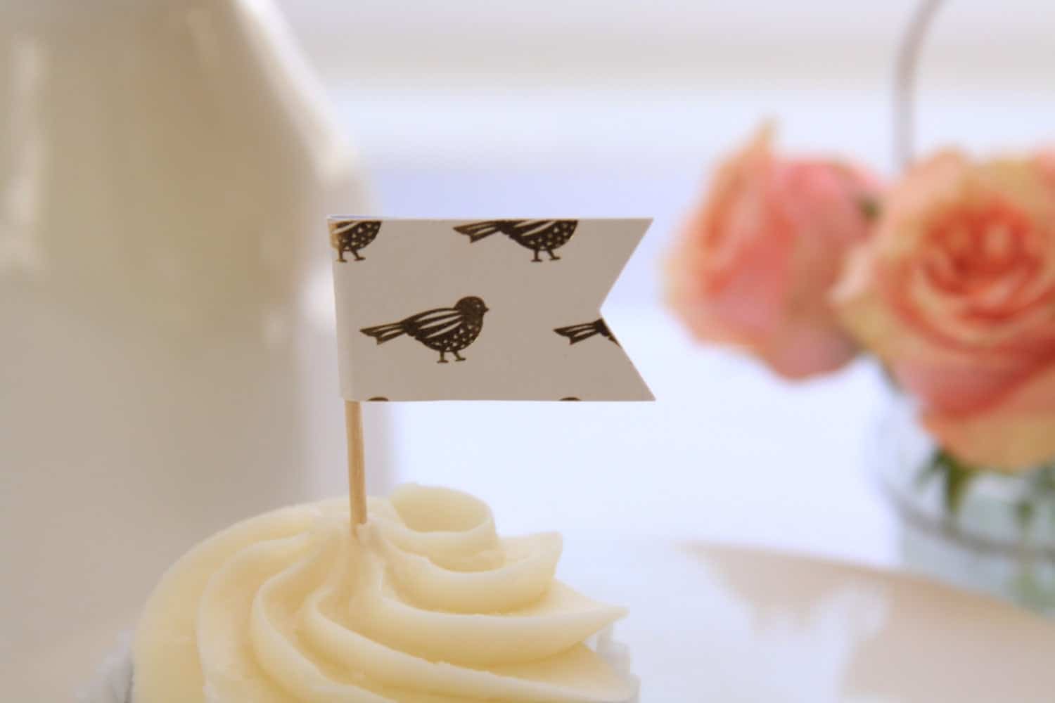 Set of 12 cupcake flags adorned with cute gold foil birds.
