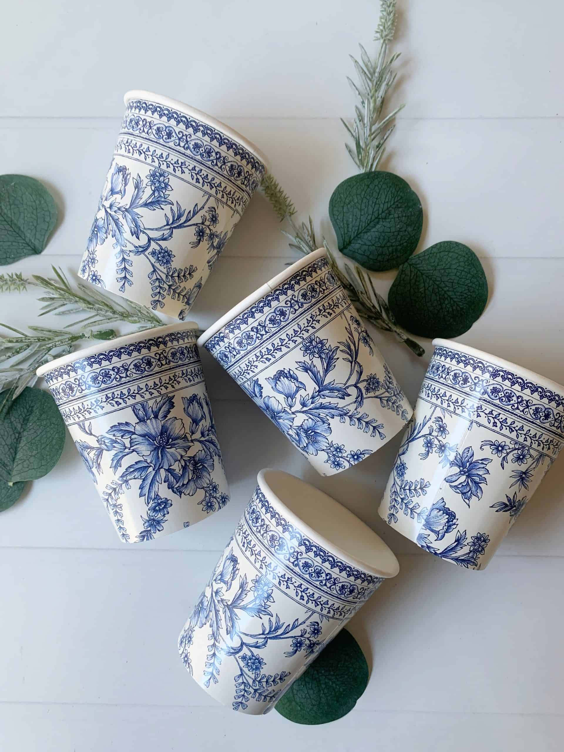 Beautiful blue toile paper cups in sets of 10. When you are ready to dish up your Thanksgiving dinner, a bridal shower luncheon, or a baby shower buffet, make sure that you do it in style. With a stylish farmhouse-inspired design these cups will set a beautiful table with stylish understated patriotic flair.