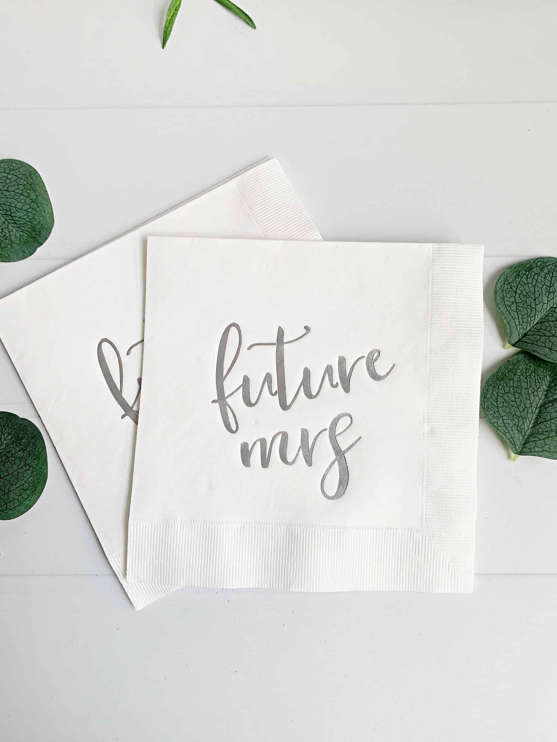 Three-ply tissue napkin, with a silver foil script Future Mrs on the front of each napkin.