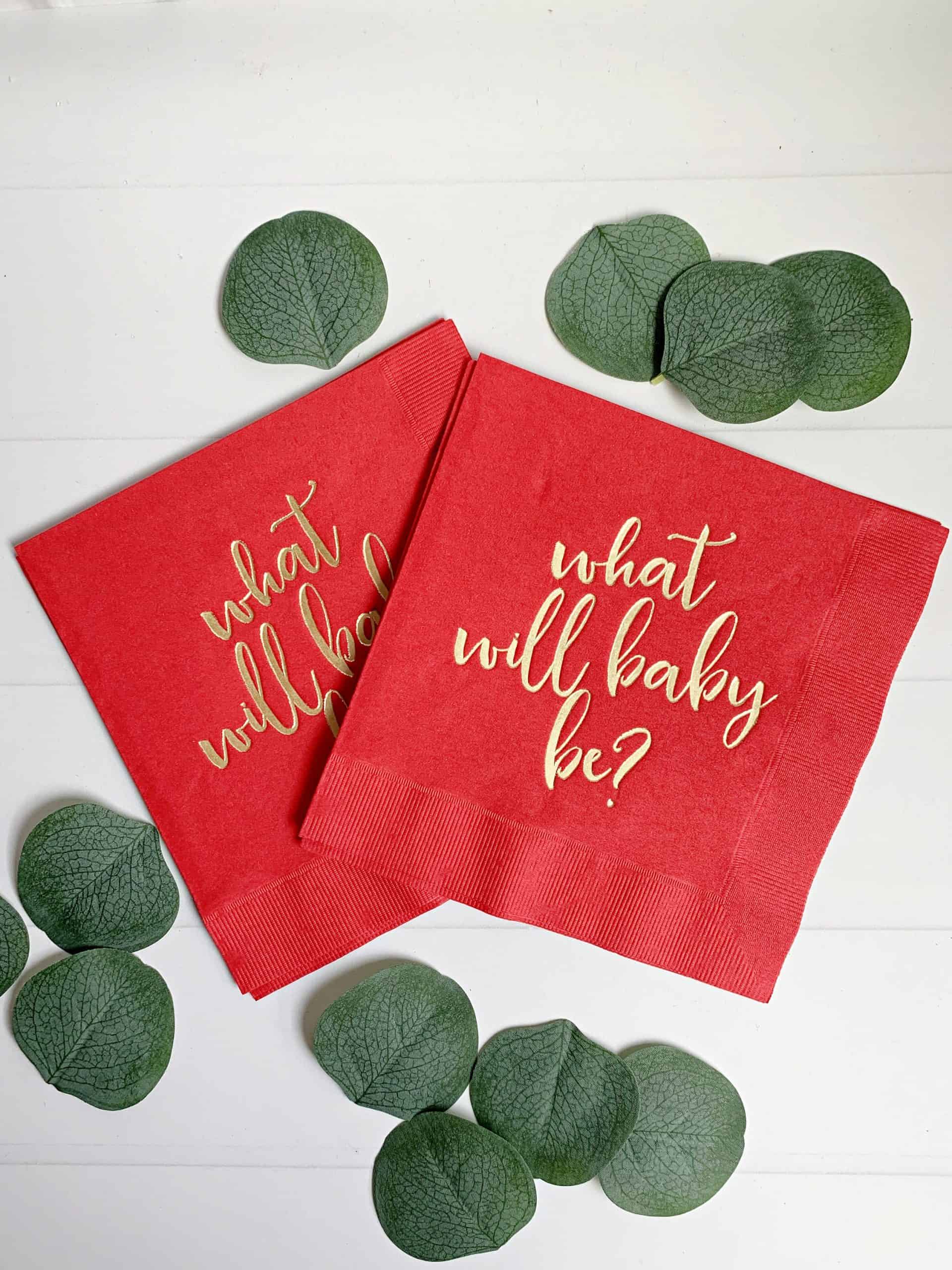 These fab red gender reveal paper napkins are the finishing touch for your gender reveal party! Each napkin has a beautiful script "What will baby be?" in gold foil.