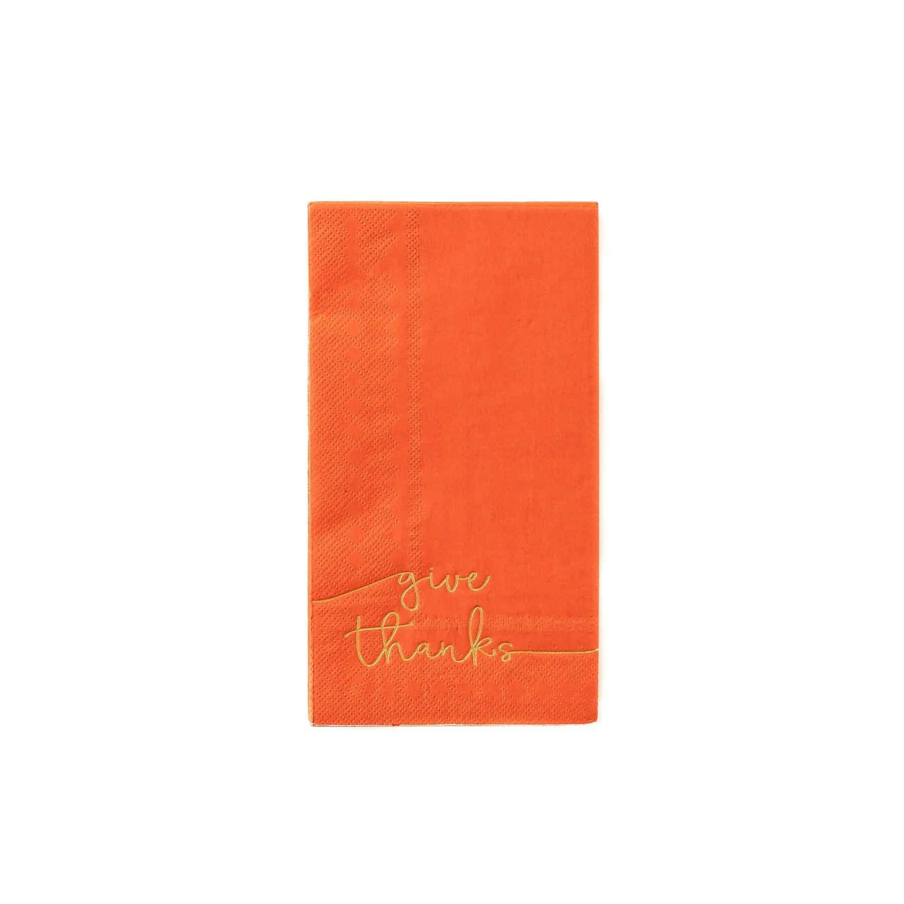 Orange napkins with gold foil 'give thanks" on each dinner-sied folded napkin. Perfect for Friendsgiving and Thanksgiving.