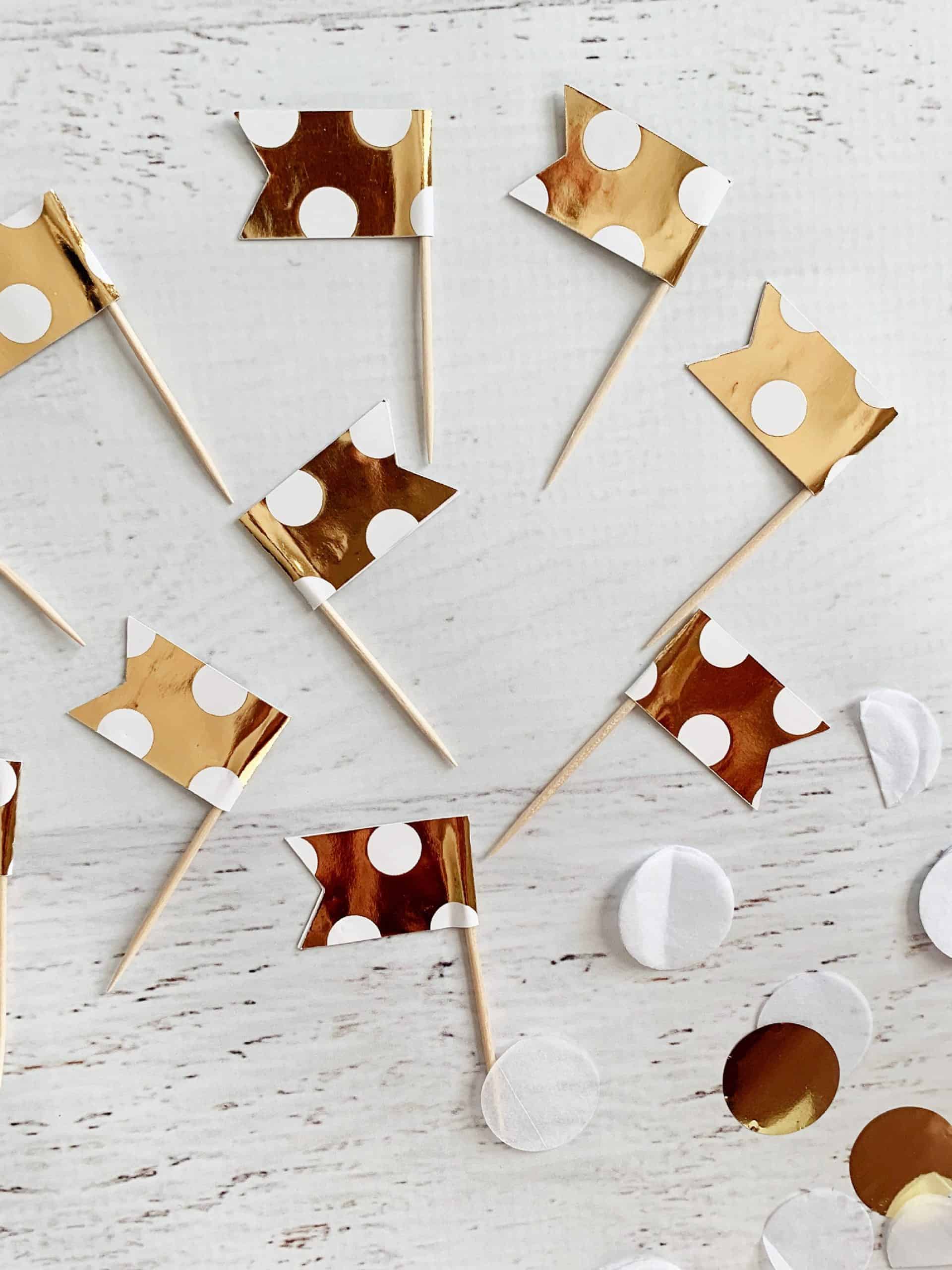 Elegant gold polka dotted cupcake flags - perfect for appetizers and snacks too.