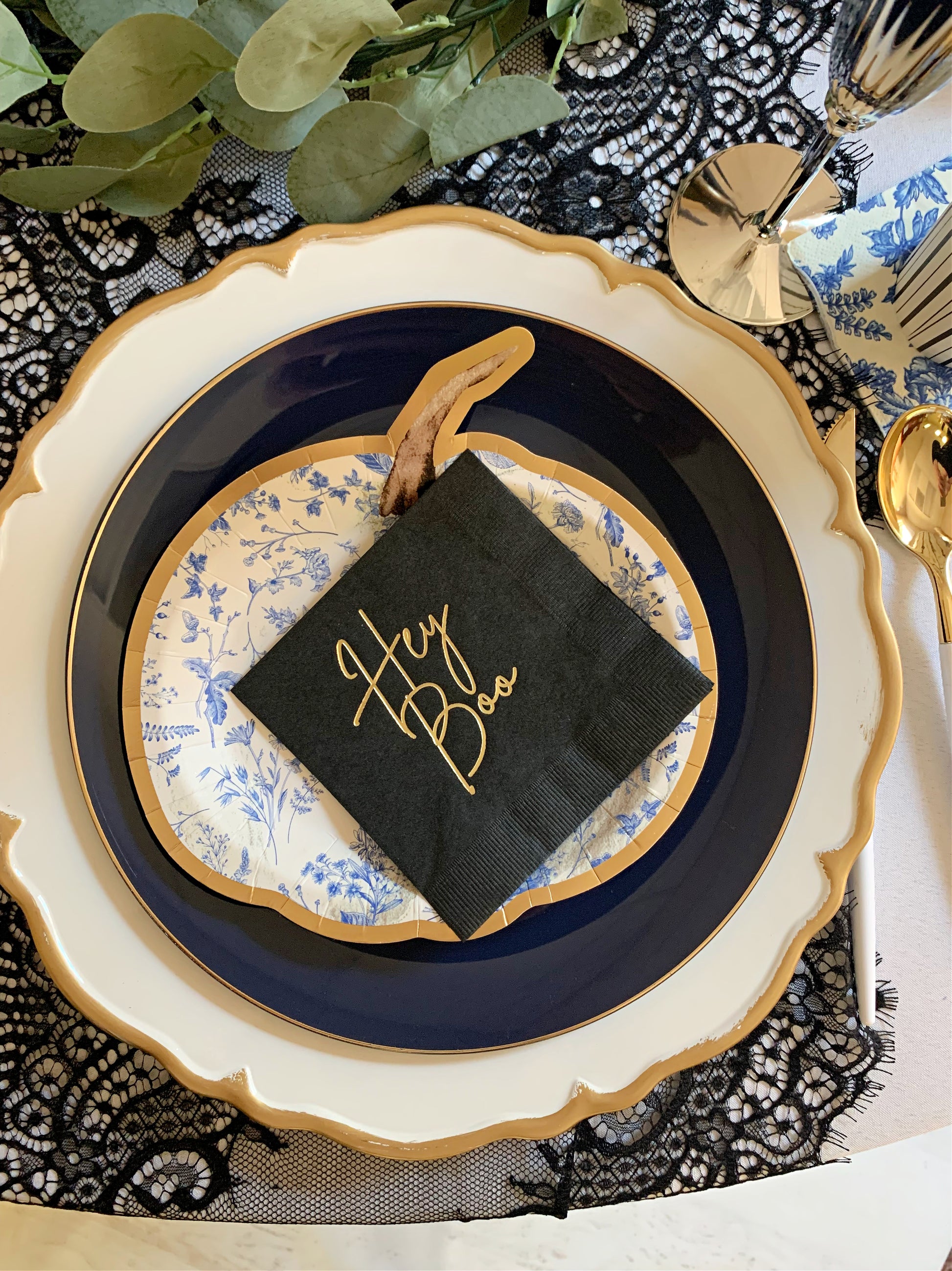 Black and gold Halloween cocktail napkins for your Halloween party or fall birthday party. Don't miss the rest of the Halloween decor in the shop to round out your haunted soiree including tableware to serve your Halloween treats. Each black cocktail napkins is stamped in gold foil with "Hey Boo"