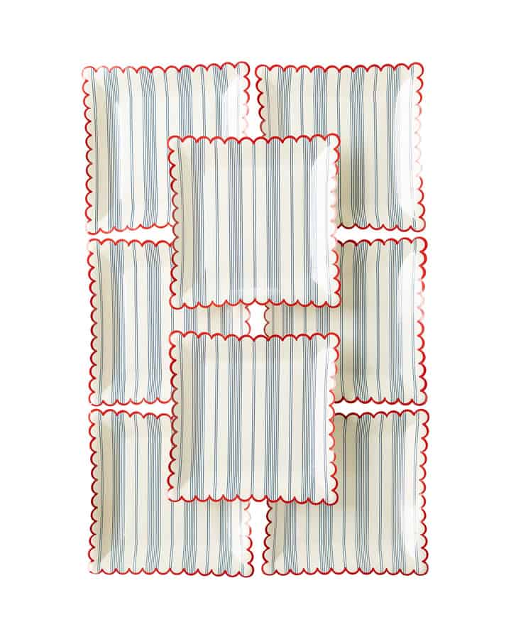 Infuse your gatherings with a delightful blend of classic summer coastal style and vintage Americana using our charming Striped Scalloped Plates. These plates feature a festive blue stripe pattern that adds a touch of flair to your table, whether you're hosting a patriotic celebration or enjoying a beachside picnic. With their red scalloped edge, these dinner-sized plates are the perfect choice for savoring summer favorites during your Fourth of July festivities.