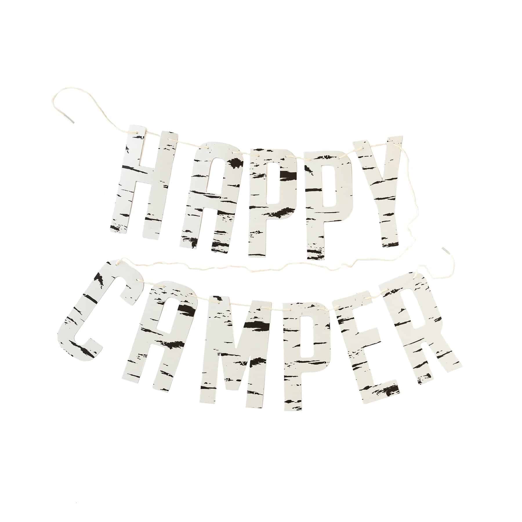 You don't have to wander far into the mountains to be a happy camper, with this rustic word banner. In 6 inch high letters with a faux birch bark pattern this banner spells out "Happy Camper" and is the perfect addition to an adventure-themed birthday party or a camping theme baby shower.