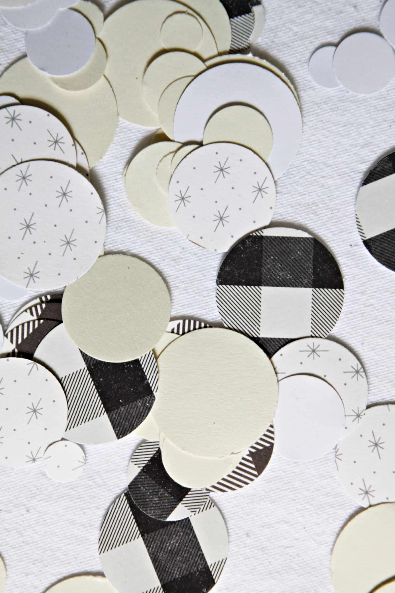 This cute little sprinkle of confetti is made from assorted papers in black and white buffalo check cardstock and shades of white, ivory and black cardstock. (Wood disks not included, but message me if you need some!)