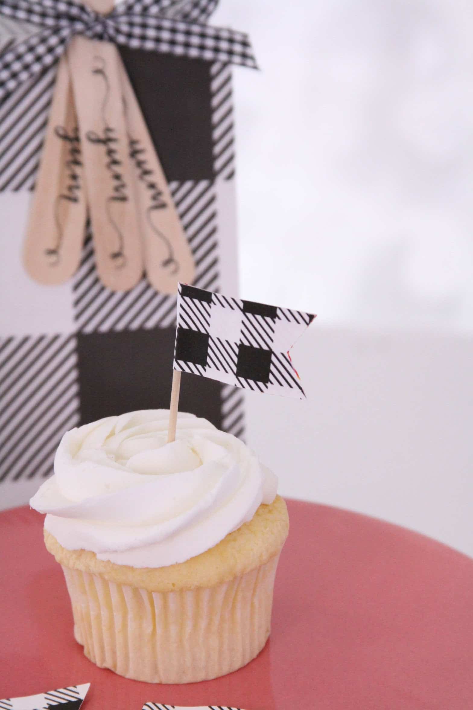 Select a set of 12 ivory and black buffalo check plaid cupcake flags.