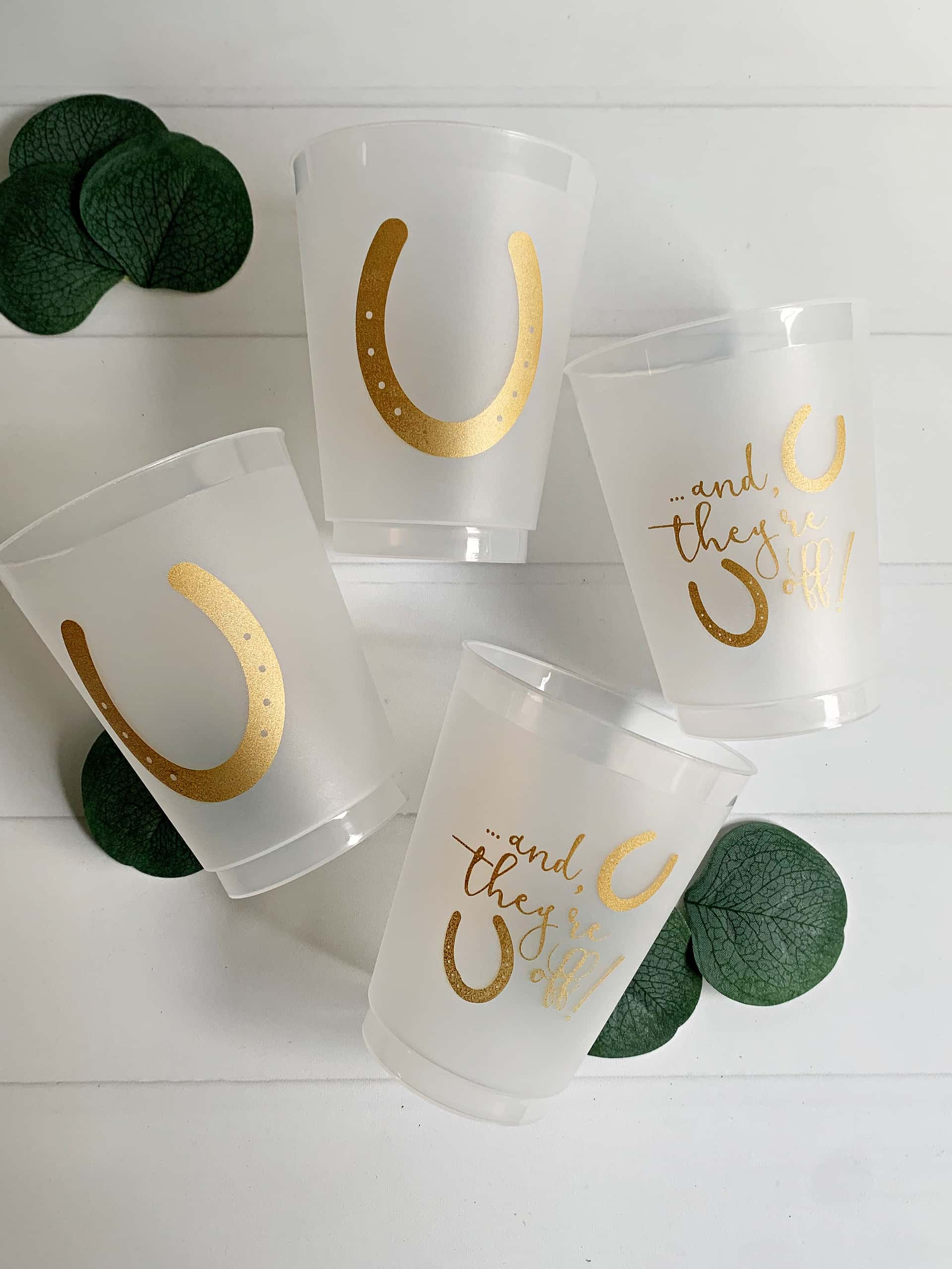 Serving mint juleps or other cocktails at your Kentucky Derby party, derby bridal shower or or other horse-race-themed event? These stylish frosted cups are perfect for mixed drinks. One side has a single gold horseshoe, and the other side says, "And they're off." If you'd like a larger size, these are a little larger than our standard size 12-ounce cups. The perfect glass for lemonade or other non-alcoholic drinks as well.