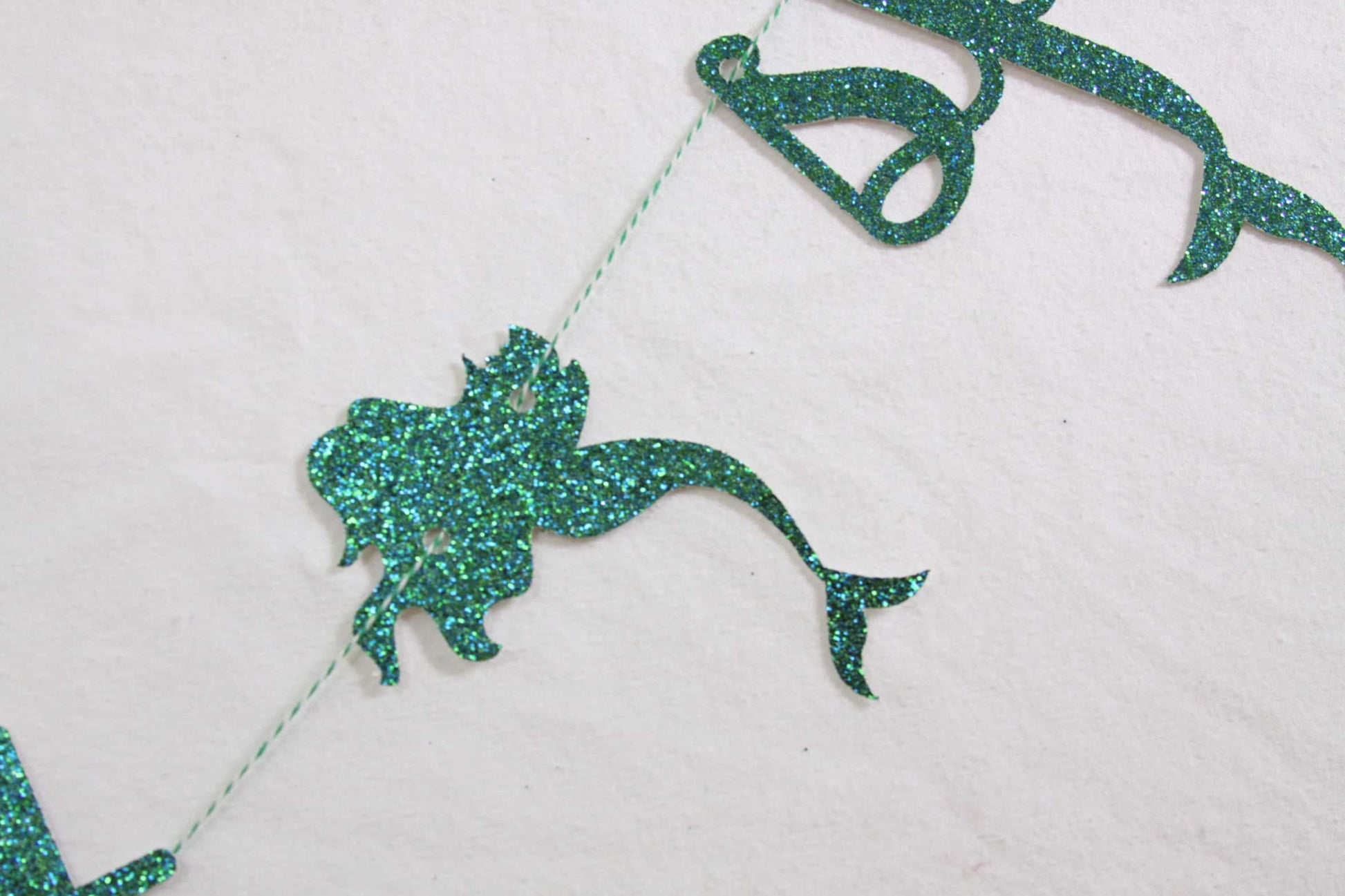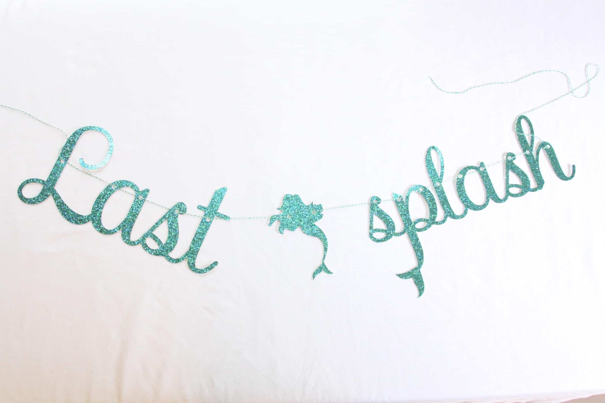 Cursive "Last" and "Splash" and a cute little sparkly mermaid are strung on an aqua and white twine.