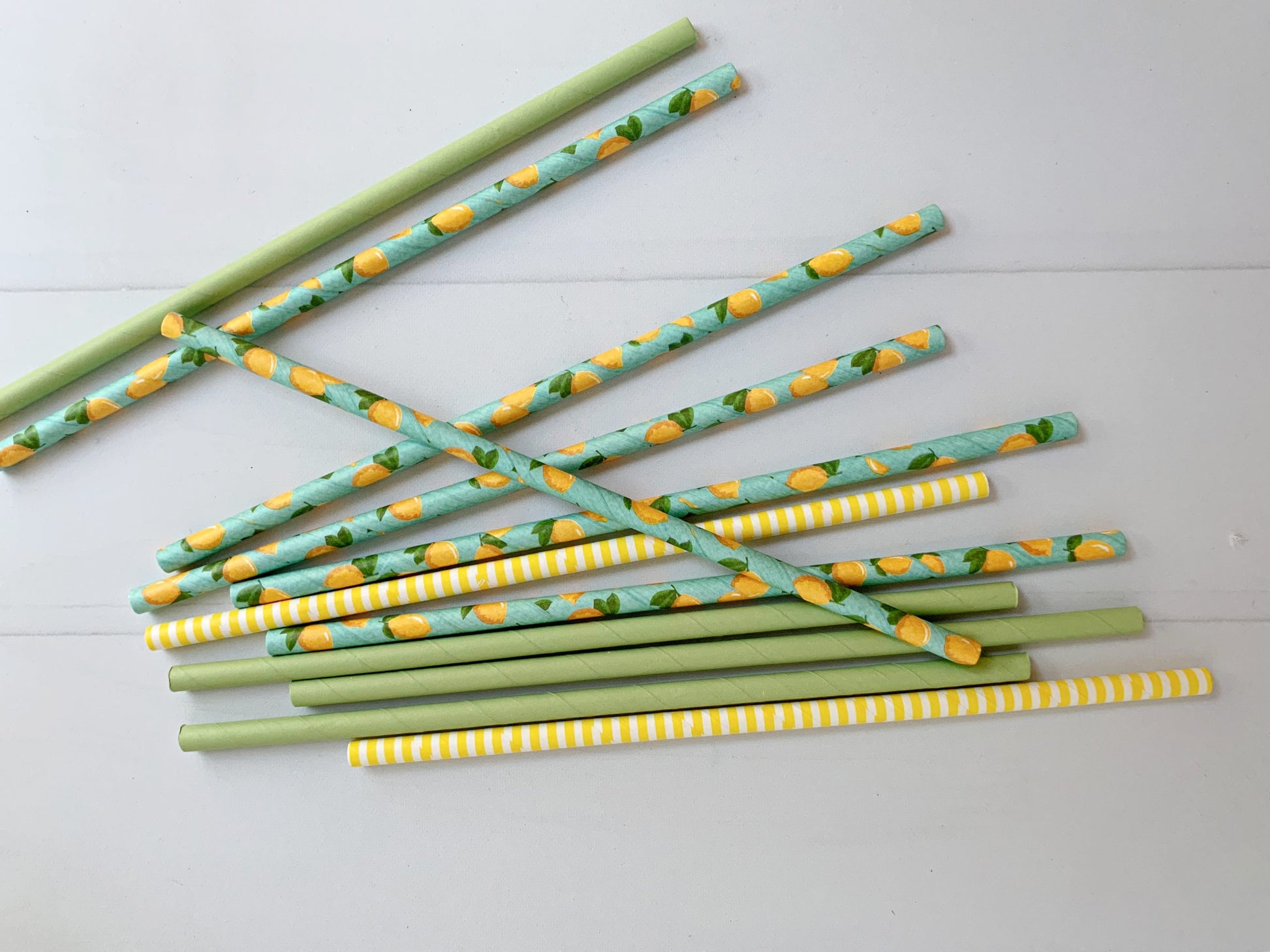 Each set includes 12 paper straws in shades of lemon yellow, aqua, and solid sage, as well as a charming pinstripe yellow design, ensuring that your beverages are served in style. These eco-friendly straws are perfect for adding a pop of color to your drinks while reducing single-use plastic waste.