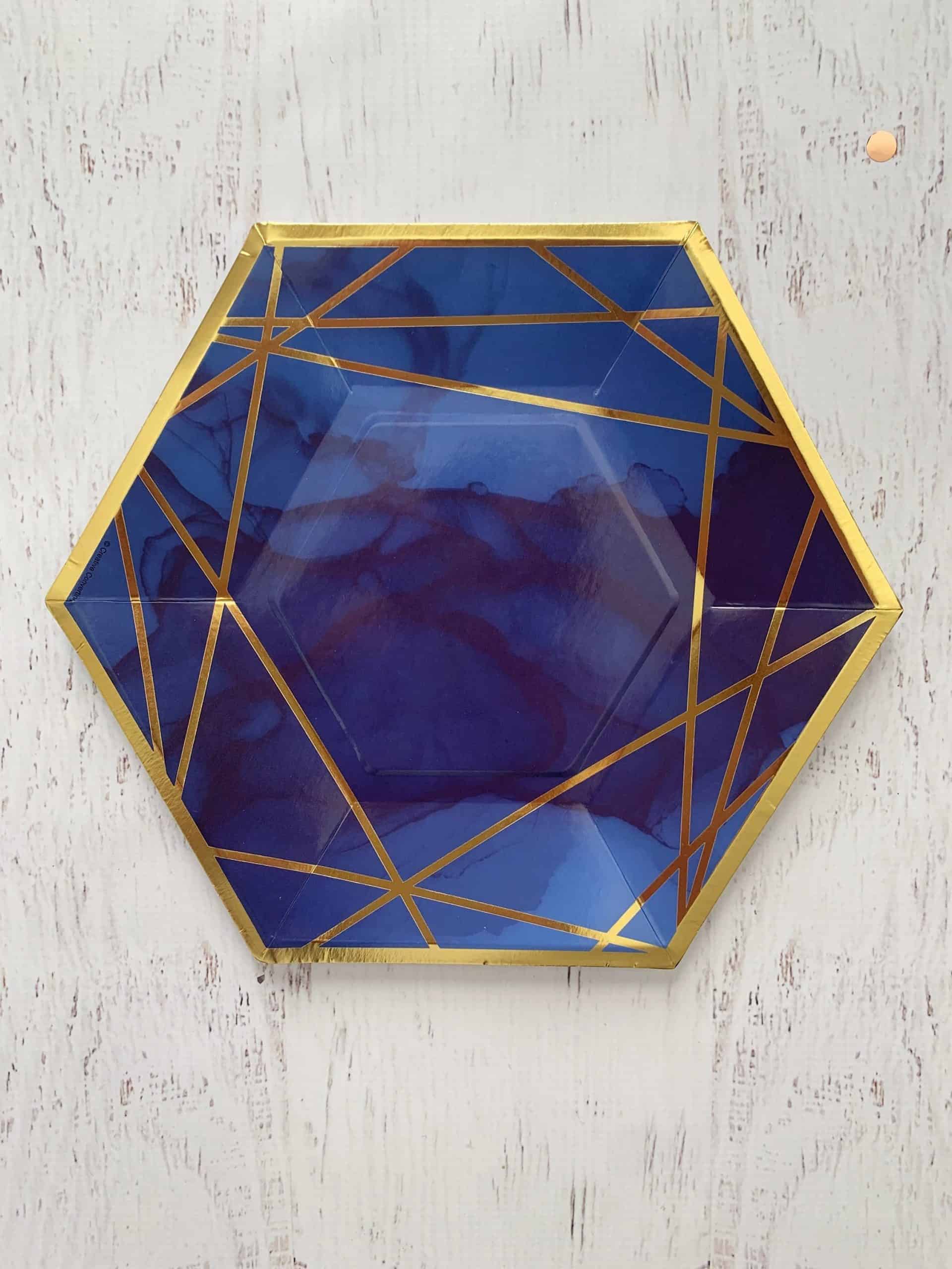 'Serve up the main course on these beautiful Navy Blue and Gold Foil Paper Plates. Featuring an elegant navy blue background with a gold foil geometric design, these plates are the perfect addition to any celebration. Perfect for graduations, an Oh Boy baby shower, or guy's birthday.