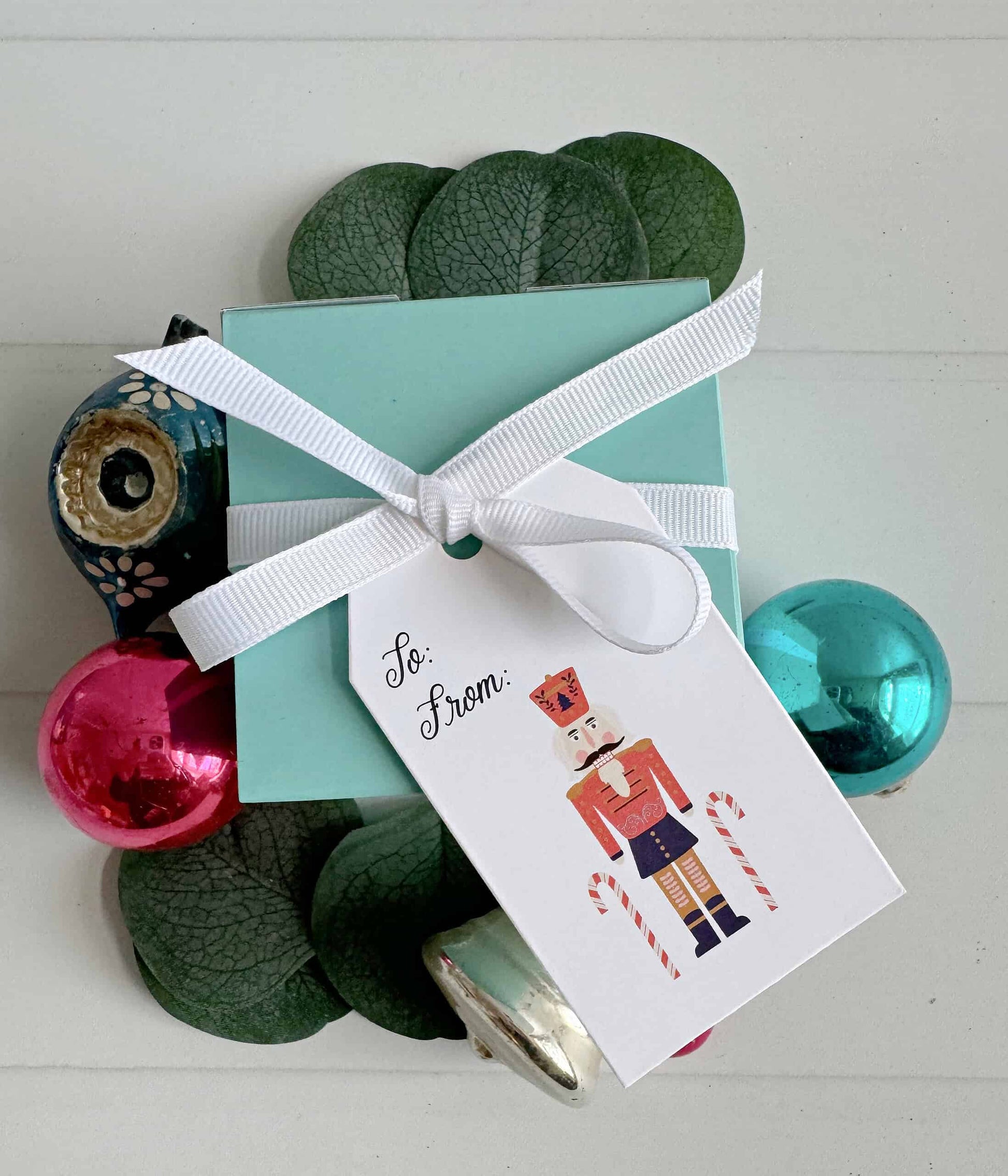 Each set comes with 10 gift tags, providing you with an abundance of options to adorn your holiday presents. For a cohesive and coordinated look, pair these tags with our Nutcracker gift bags and tissue, both available for separate purchase in our shop. In the product images, the tags are showcased on our robin's egg blue 3 inch gift box, which is also available in the shop.