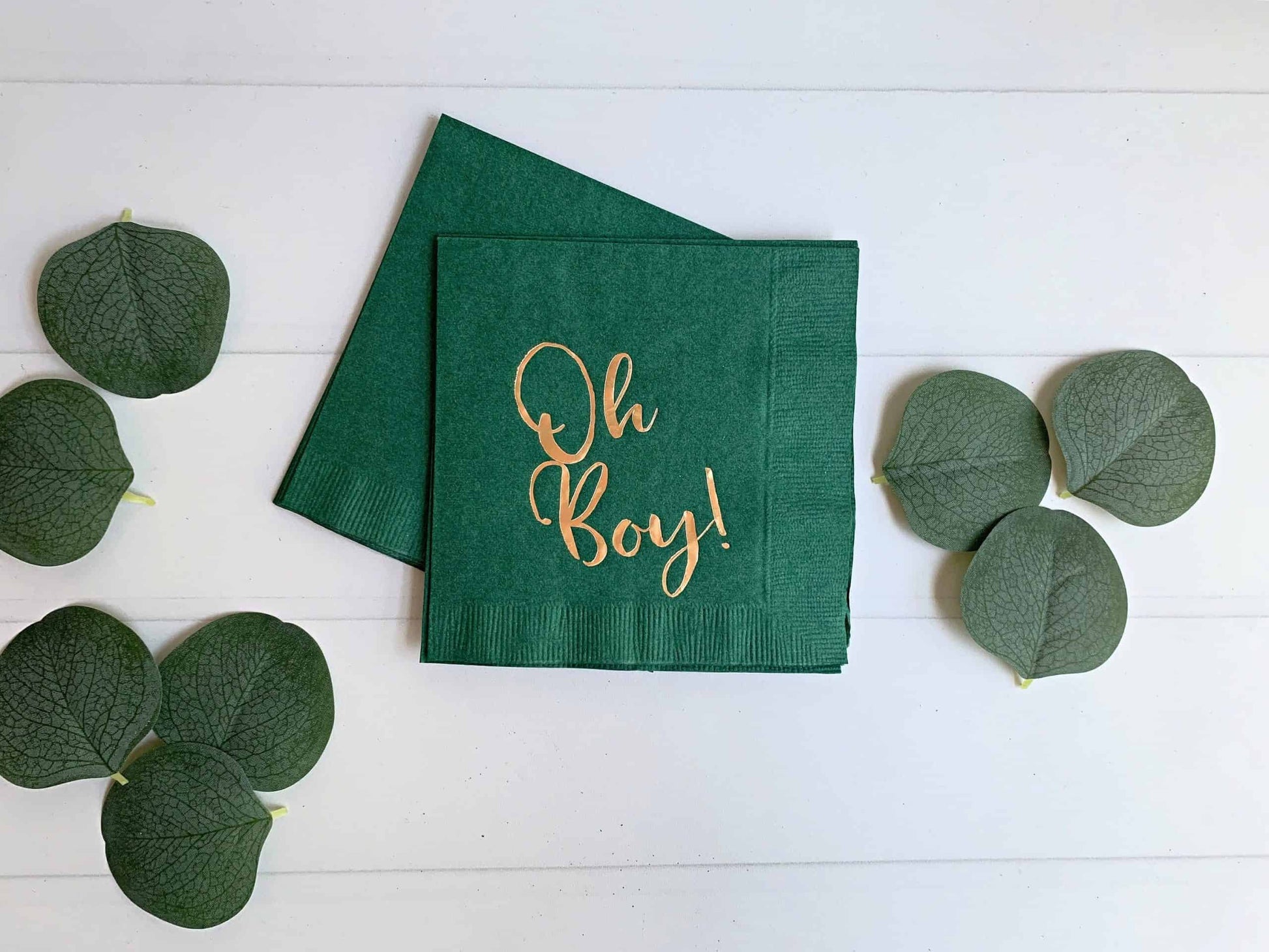 'Oh Boy' in gold foil on forest green paper napkins are the perfect touch for balancing all the tasty treats that will be served at the baby shower!