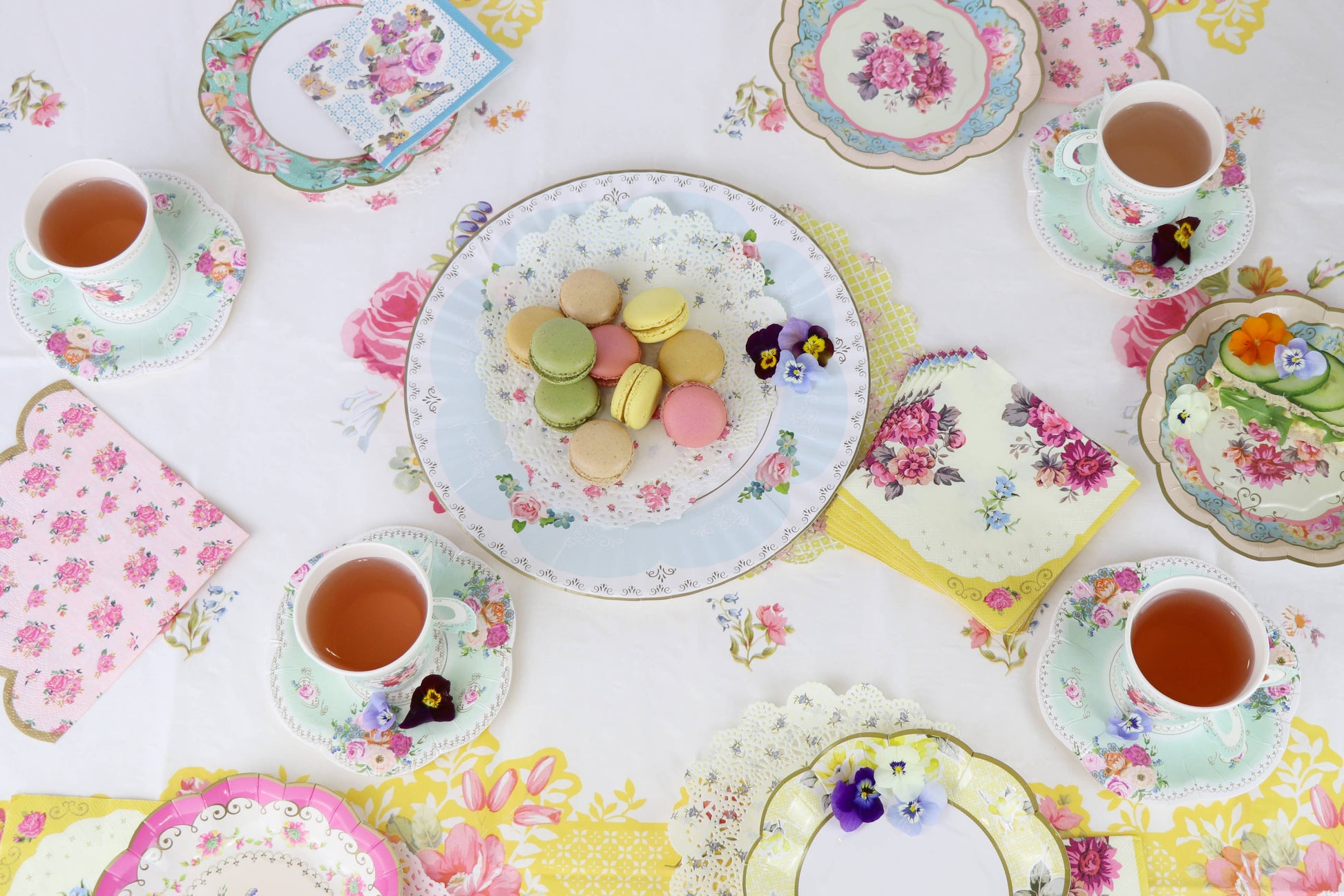 Serve your tea sandwiches, petit fours, appetizers and any other party treats in style with our beautiful Tea Party Serving Platters. These disposable paper trays feature a charming vintage chintz floral pattern in soft pastel colors, making them perfect for Alice in Wonderland tea parties, baby showers, bridal showers, and garden party celebrations.