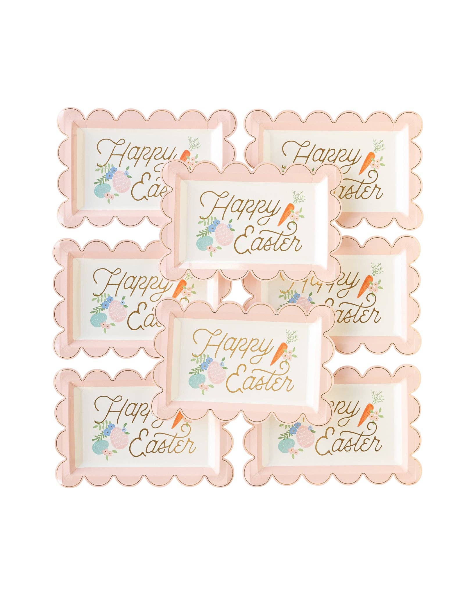 Celebrate Easter in Style with Our Happy Easter Scalloped Cake Plates! Bring a touch of elegance and charm to your Easter celebration with these beautiful Happy Easter scalloped cake plates. Featuring a blush and gold foiled edge, and charming gold "Happy Easter" and little eggs and carrots in soft spring colors, they're the perfect choice for your cake and dessert needs.