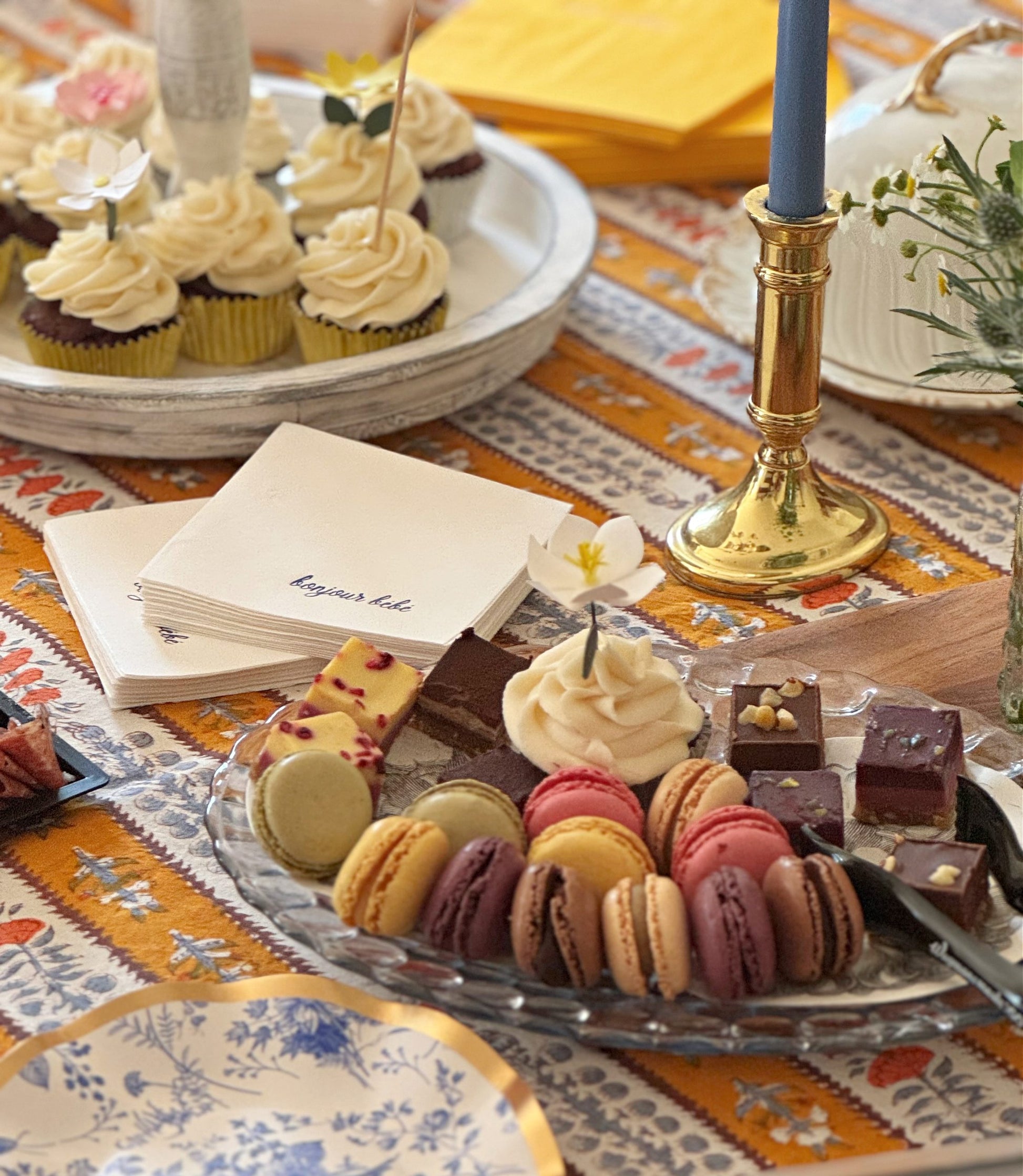 Transform your dining experience with this exquisite 70 x 128 inch tablecloth from the Provence Avignon collection. Inspired by the sun-drenched landscapes and historic charm of Avignon, France, this premium tablecloth features delicate botanical designs in sophisticated Dijon yellow and classic blue tones. This is perfect for a Bonjour bebe baby shower and you can see if in our blog post featuring that collection.