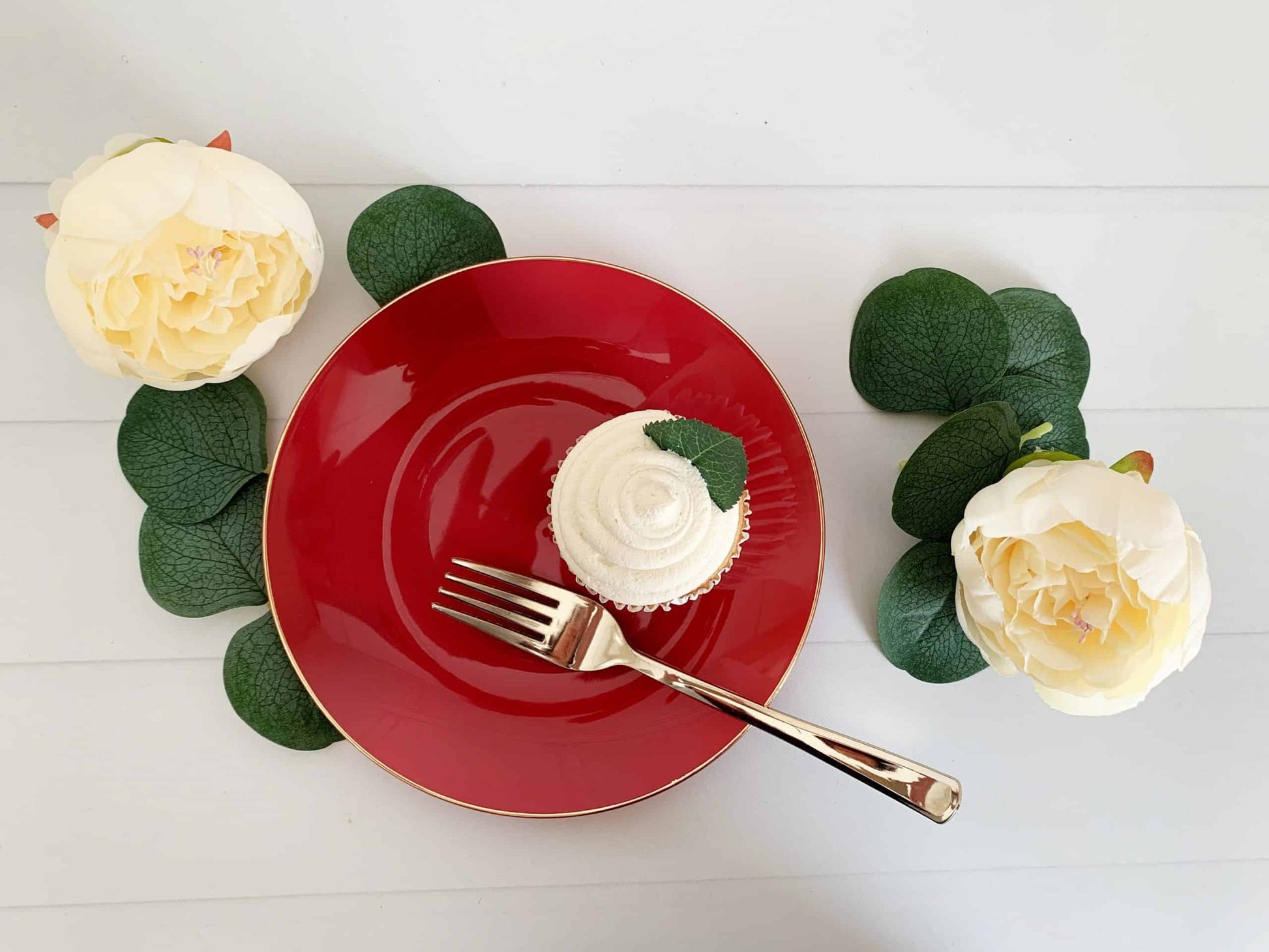 Transform your table into a showstopper with these timeless cranberry and gold plates that do the styling work for you.