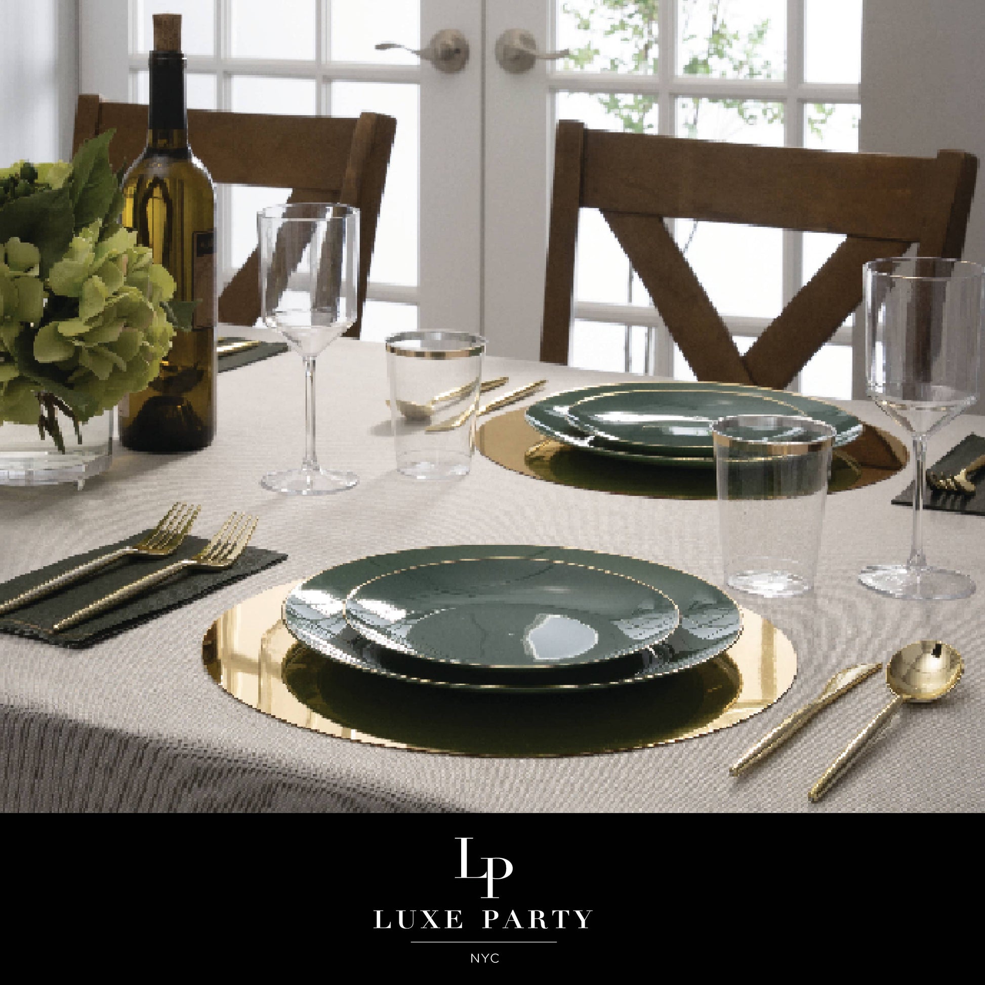 Celebrate special occasions in style with our eucalyptus (medium) green with gold-edged plastic dinner plates. They are the perfect size for lunch or dinner. Perfect for wedding tableware, a baby shower, or bridal shower.