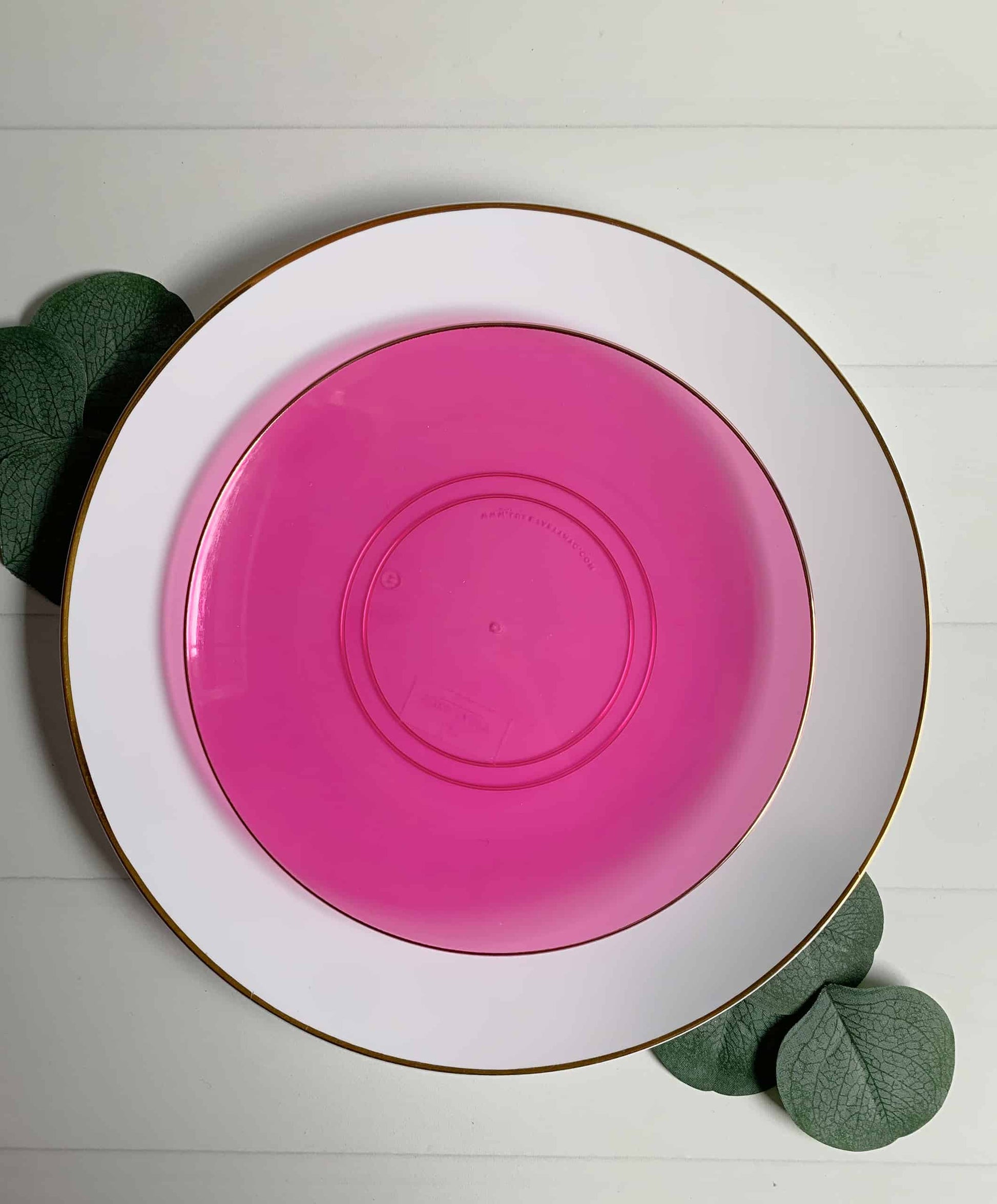 Crafted from premium plastic, these plates feature a stunning translucent design in a vibrant hot pink hue, accented with a luxurious gold metallic rim.