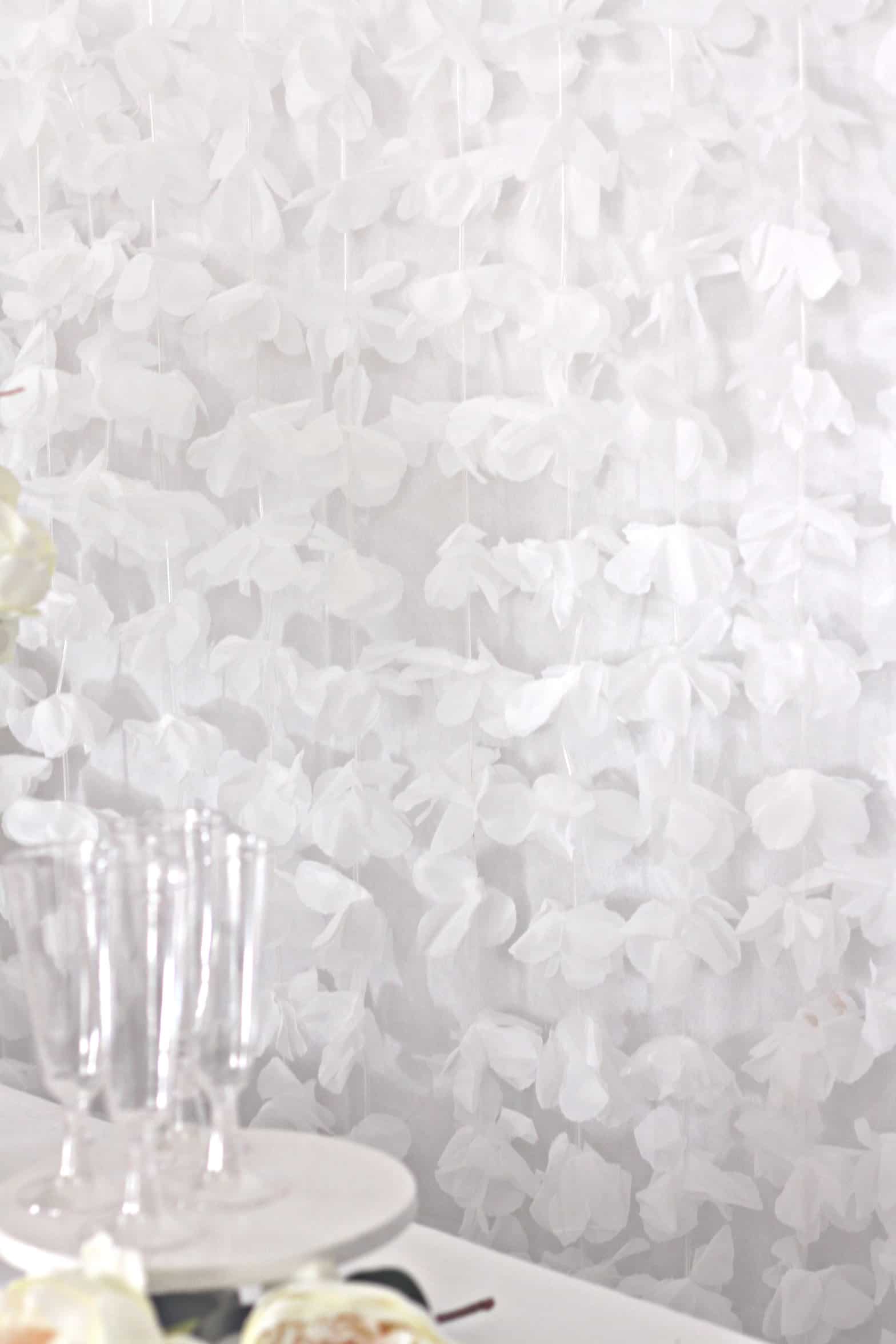Hang our 'White Floral backdrop' for a beautiful cascade of white flowers that will turn your wedding, bridal shower, or baby shower venue into a rustic country dream.