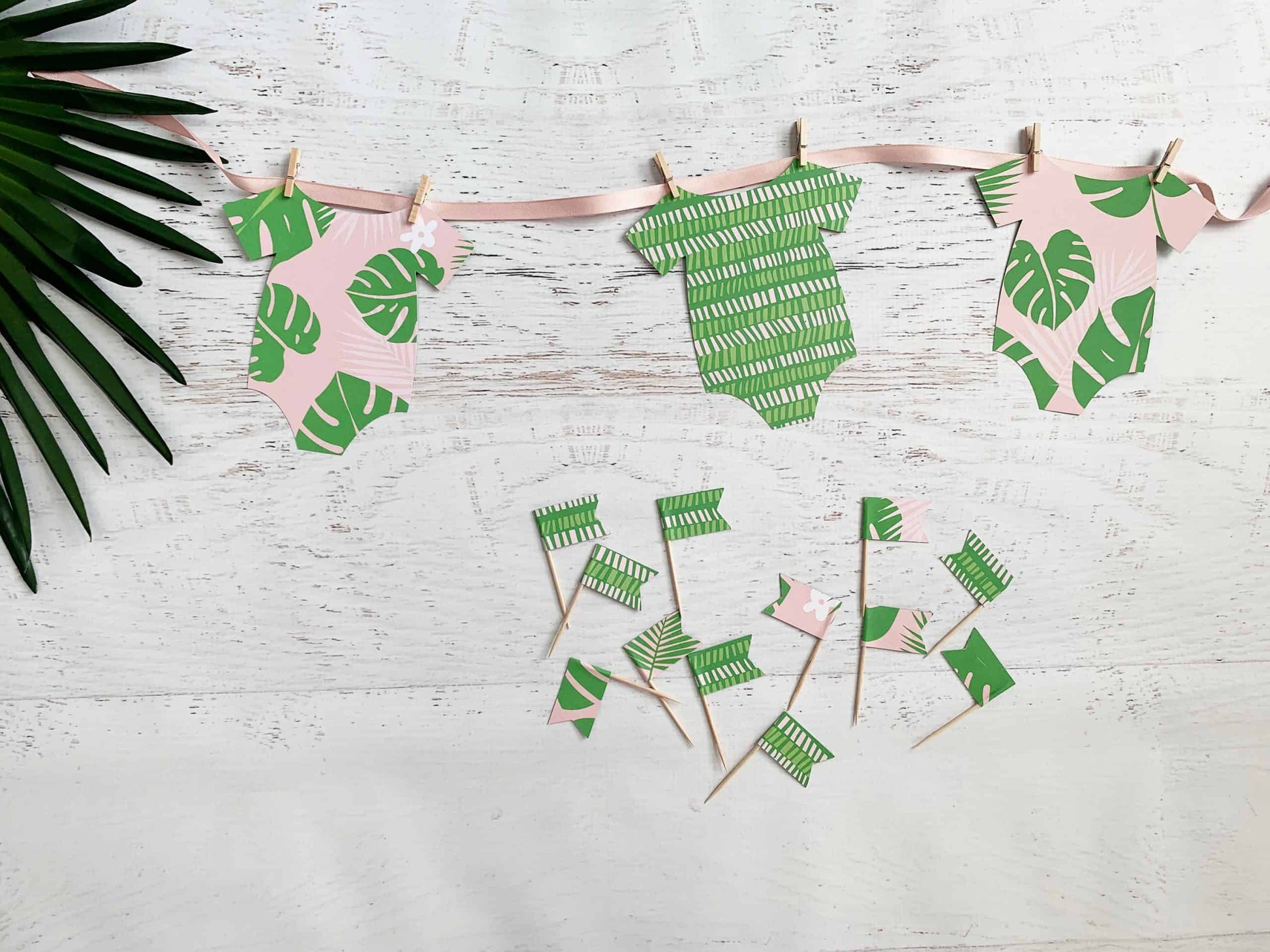 An adorable tropical onesie banner for the new baby on the way! Perfect for a "Wild One", "safari" or tropical themed baby shower.