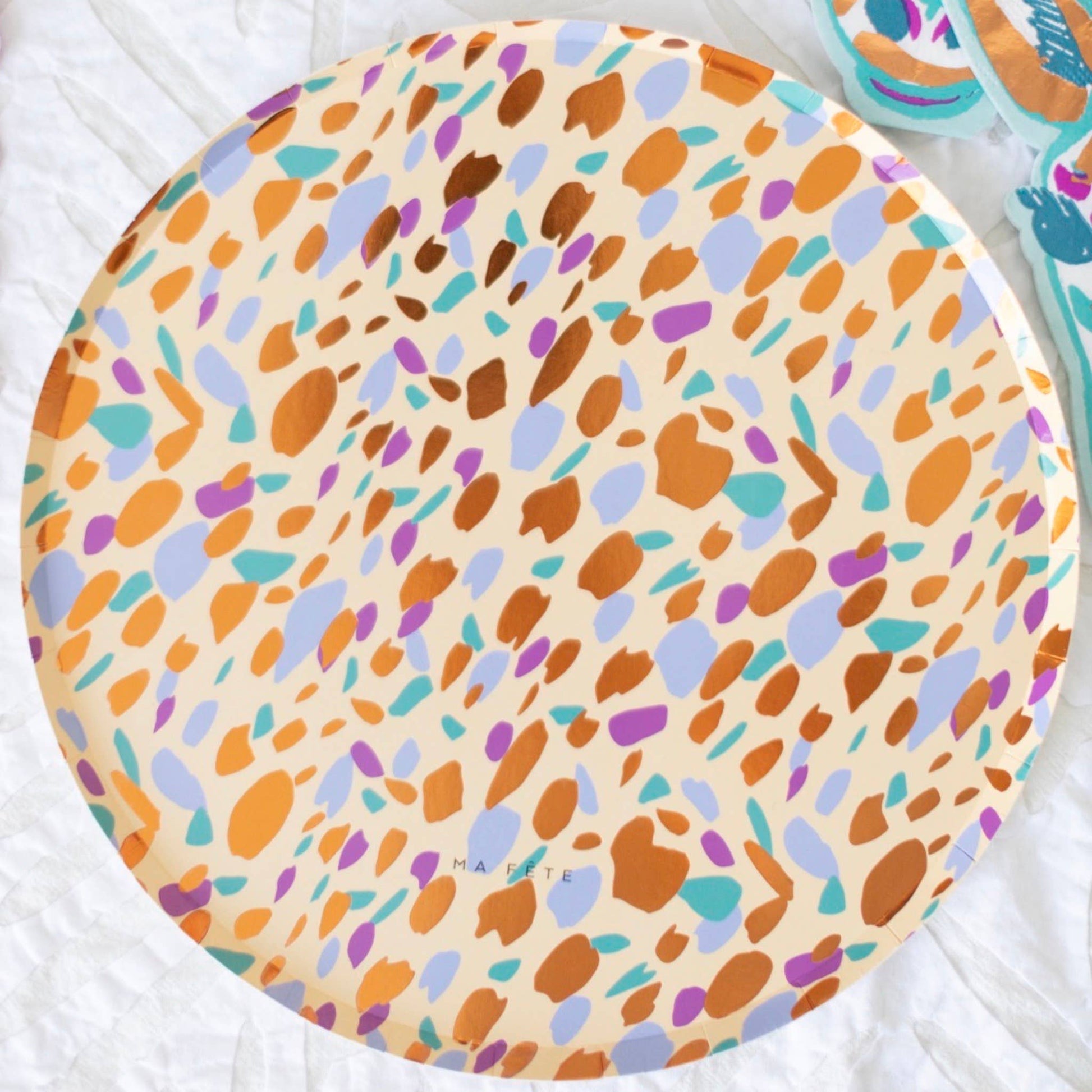 Two Designs, One Pack: With 8 plates in a pack, you'll receive 4 plates of each design; Zebra pattern in turquoise, purple, and amber, and a Cheetah pattern in gold, purple, and periwinkle.
