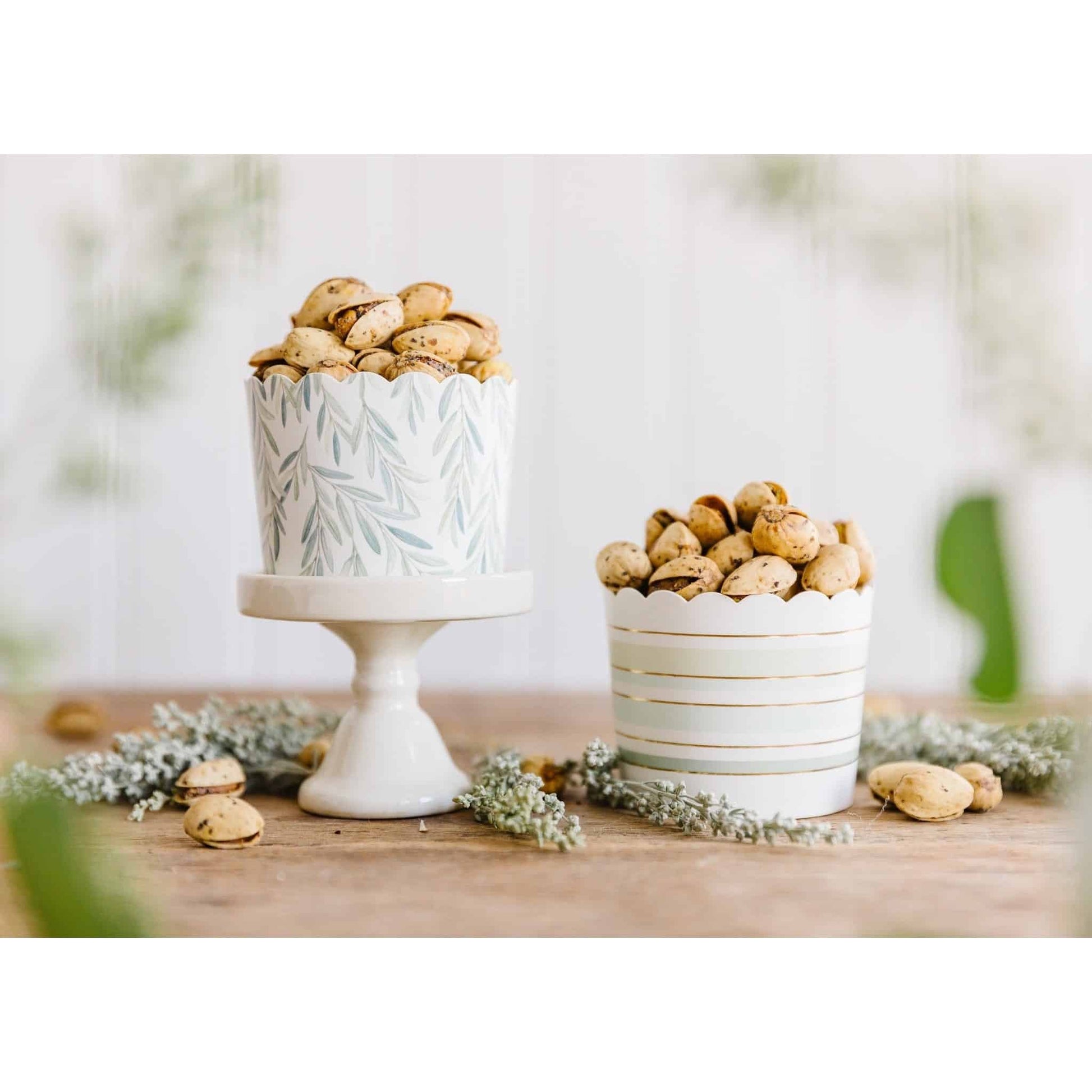 These sage leaf and striped baking cups are perfect for baking cupcakes right in the oven. But don't limit yourself, there are so many great uses for them: add candy and wrap in cellophane for a holiday neighbor gift or party favor, cut up veggies and add dip for the perfect hors d'oeuvres at a party, bake mini quiche, or fill with fun snacks! There are so many options with these adorable cups!