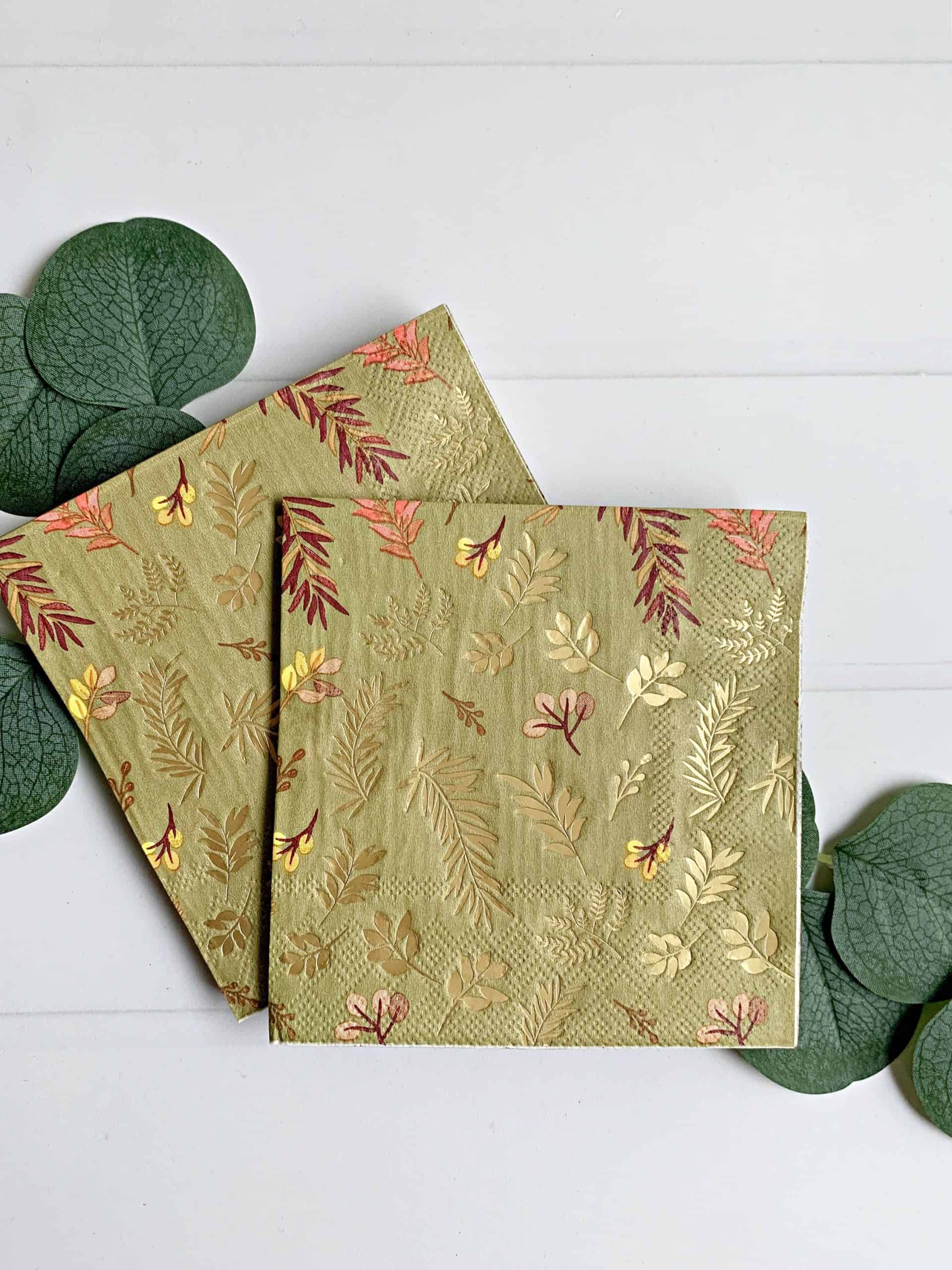Gorgeous gold foiled autumn sage botanical print napkins - fall leaves and icons on a sage/olive cocktail napkin. Perfect for a fall bridal shower, wedding or baby shower. Perfect for Thanksgiving or Halloween parties.