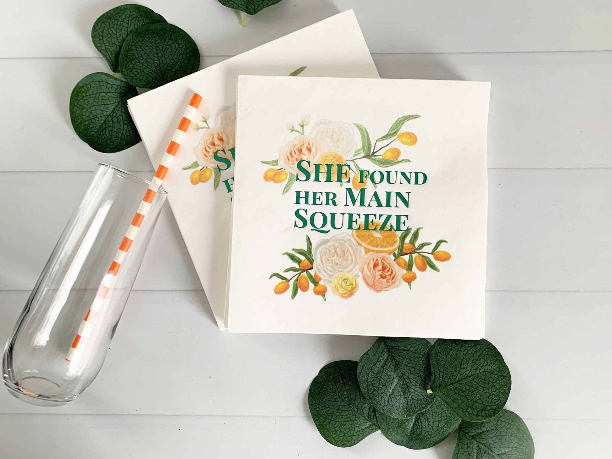 Celebrate the bride-to-be with these "she found her main squeeze" luncheon napkins. Perfect for a She Found Her Main Squeeze themed bridal shower, or citrus-themed wedding.